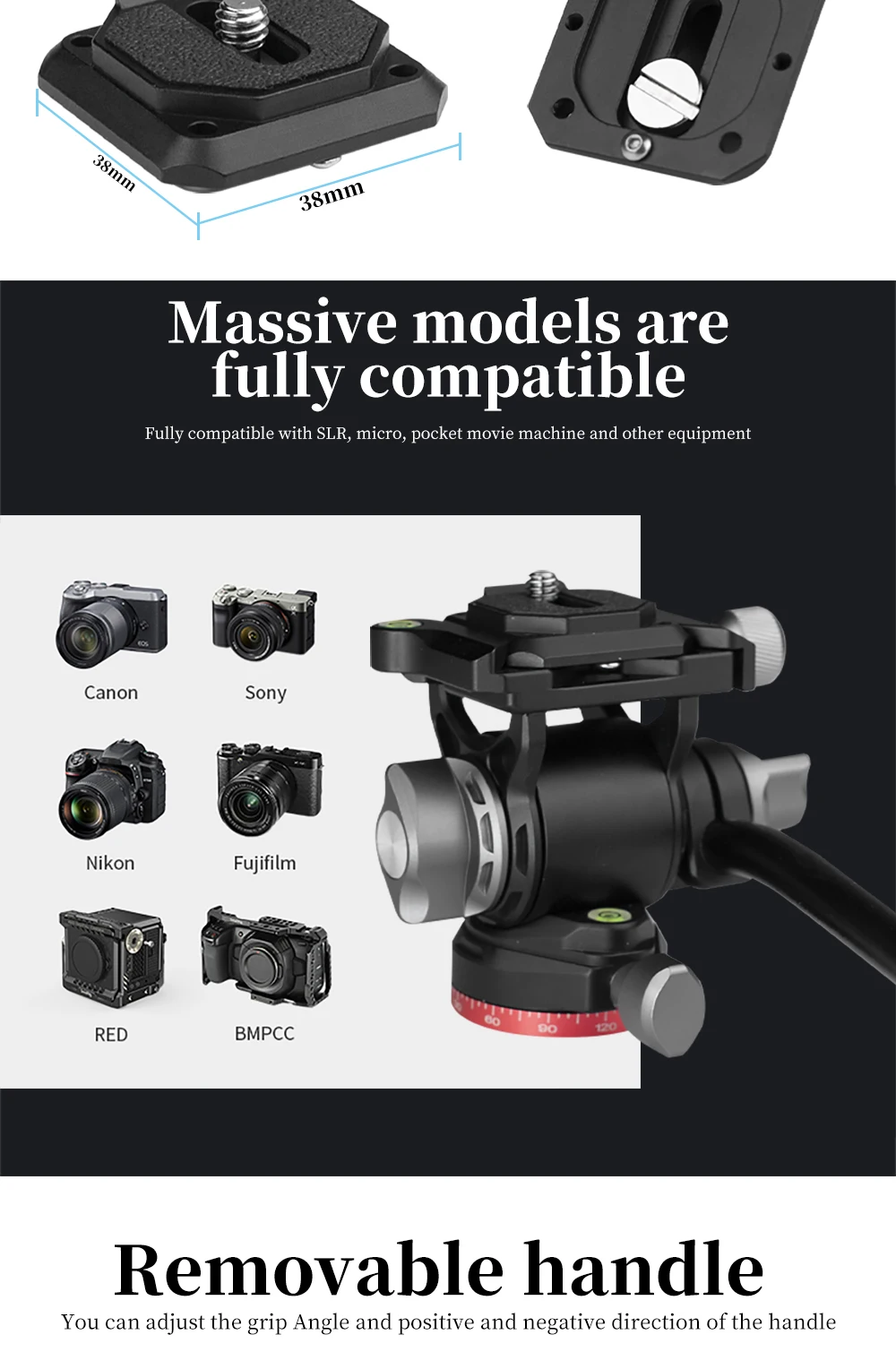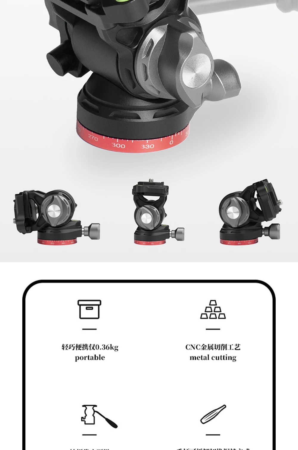 • ➤Головка для штатива-изготовлена из высококачественного алюминиевого сплава, новейшая конструкция головки для плавного панорамирования с точной обработкой, прочная и прочная, обеспечивает высококачественные решения для фотографов.