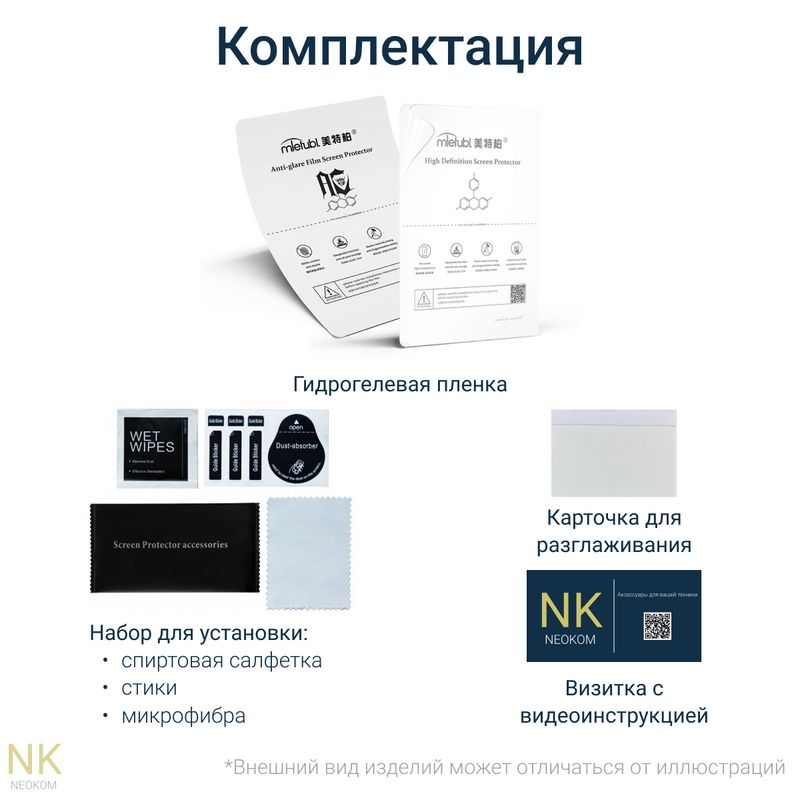 Гидрогелевые пленки, влажная и сухая салфетки для очистки поверхности экрана, стикеры для удаления пыли, стикер для удаления верхнего защитного слоя, карточка для разглаживания пленки, видеоинструкция