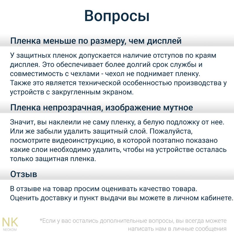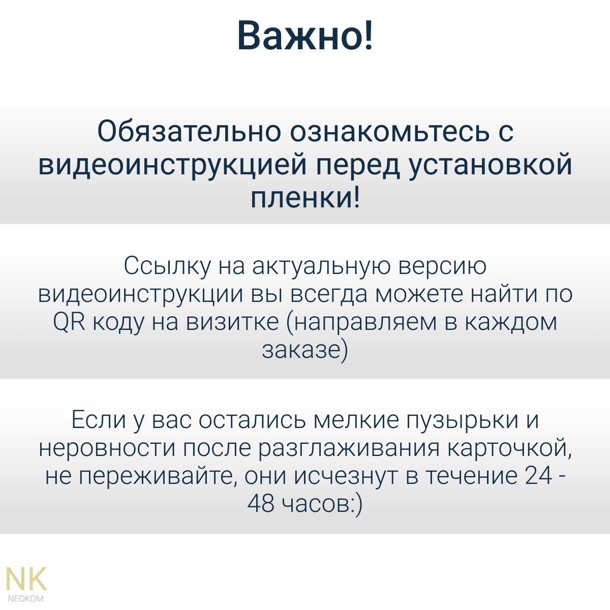- визитка с видеоинструкцией.Частые вопросыПросим ознакомиться с ответами на самые популярные вопросы:) Важно!Пожалуйста, ознакомьтесь с видеоинструкцией перед установкой пленки! Ее можно найти по Qr-коду (визитка в каждом комплекте), а также в карточке нашего товара.