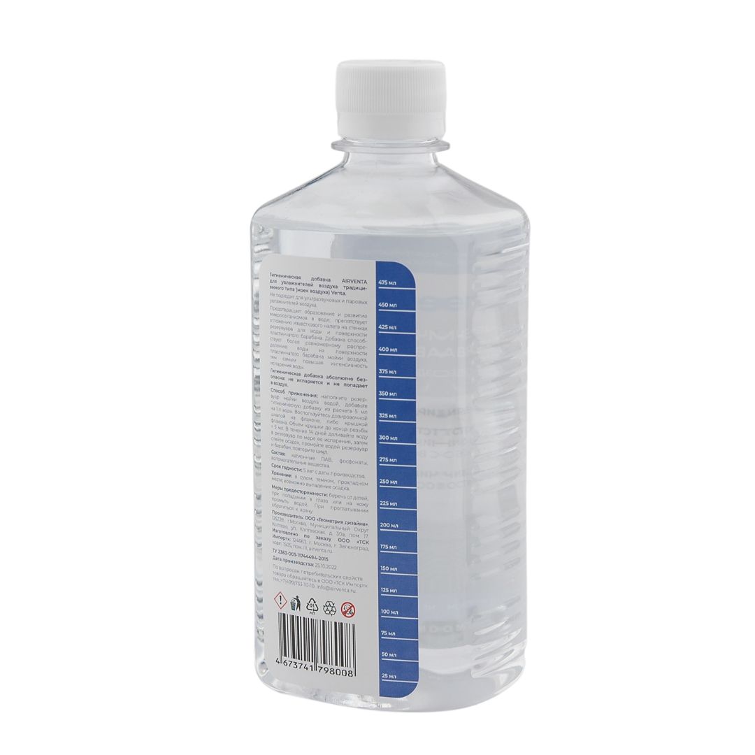 Одного флакона хватает примерно на полгода непрерывного использования в зависимости от объема бака для воды вашей мойки воздуха. Объем флакона гигиенической добавки Airventa: 500 мл. Расход: 5 мл на 1 л воды.