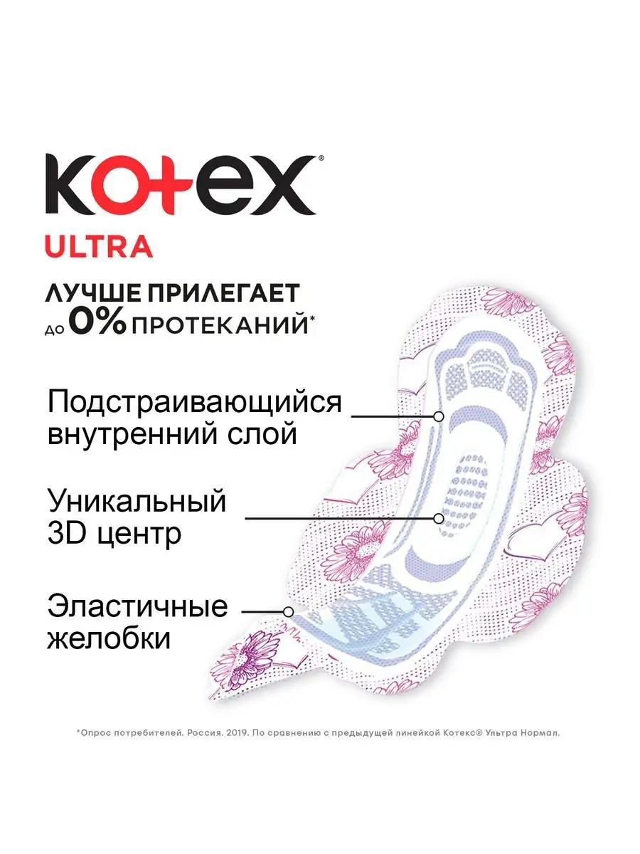 Описание: Женские гигиенические прокладки Kotex Ultra НОРМАЛ НОВЫЕ Kotex Ultra НОРМАЛ для умеренных выделений. Улучшенная защита и новый стильный дизайн. Обеспечивают комфорт и уверенность до 100%* Прокладка стала более гибкой, чтобы лучше подстраиваться под анатомию твоего тела и защищать от протеканий. ЛУЧШЕ ПРИЛЕГАЕТ до 0% ПРОТЕКАНИЙ* Уникальный 3D центр – быстро впитывает Эластичные желобки – придают прокладке гибкость для защиты от протеканий сзади Подстраивающийся внутренний слой – адаптируется под анатомию твоего тела Покрытие мягкая сеточка для максимального комфорта и сухости кожи Мягкие крылышки, надежно крепятся к белью и не натирают кожу Эстетичная форма прокладки и нежный женственный дизайн добавят удовольствия при использовании Обновленный дизайн упаковки – стильный и современный Выбирай упаковку с красной герберой! *Опрос потребителей. Россия. 2019. По сравнению с предыдущей линейкой Котекс Ультра Нормал.