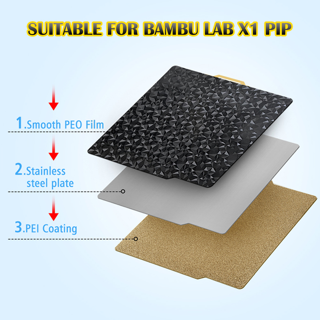 • Двусторонняя текстура PEI + Гладкая пленка PEO лист из пружинной стали * 1 (одна сторона покрыта силовым покрытием PEI, а другая сторона-пленка PEO)