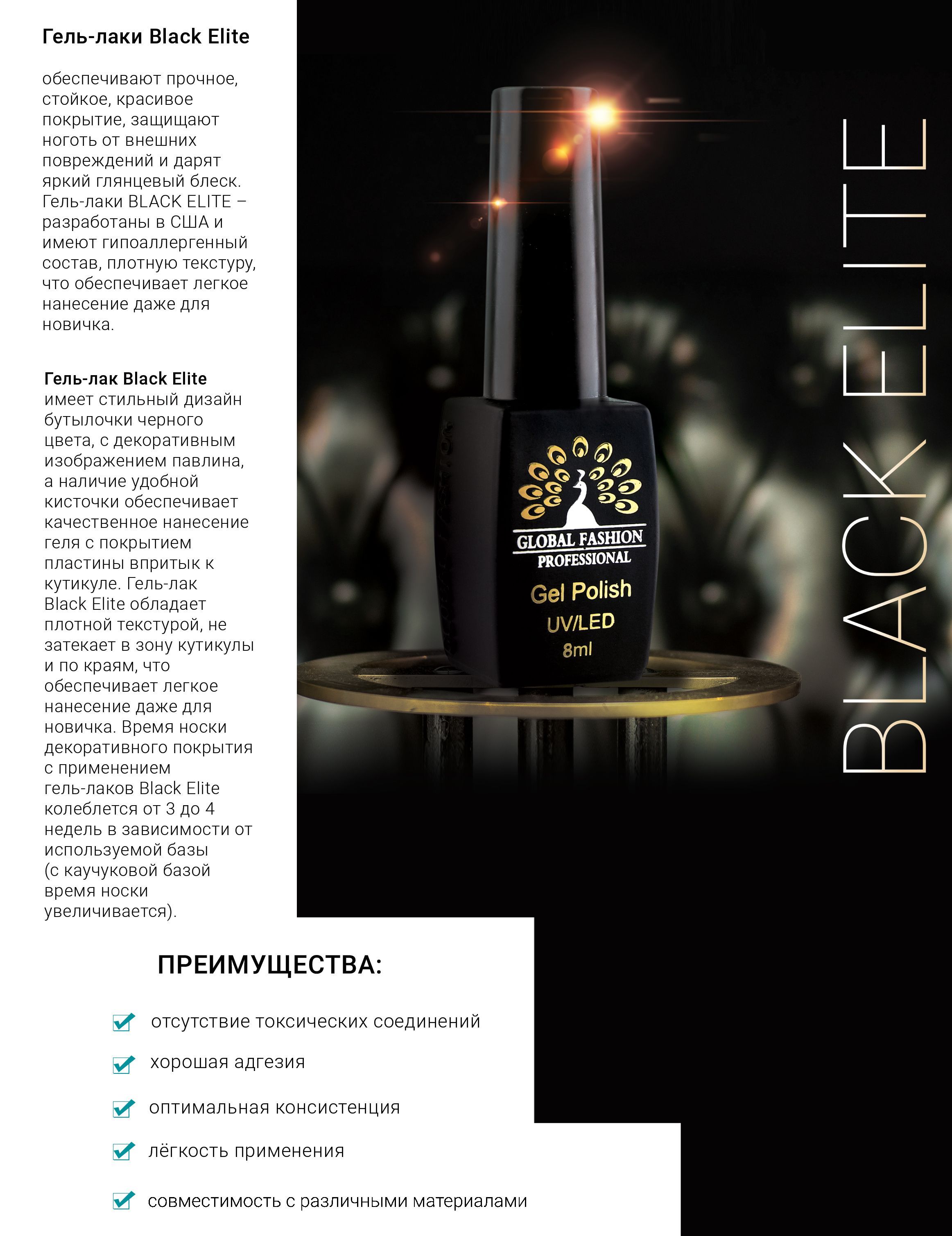 Описание: Гель-лак Black Elite - это современная профессиональная трёхфазная система гель-лакового покрытия, изготовленная из американского сырья высшего качества. Основные достоинства гель-лаков Black Elite: соотношение приемлемой цены и высокого премиум качества, уникальная безопасная формула, разработанная с учетом особенностей ногтей разных типов, идеальный глянцевый блеск, легкость и простота в использовании, длительное сохранение яркого и насыщенного оттенка, повышенная устойчивость к механическим повреждениям, отсутствие сколов и царапин на протяжении всего времени носки. Цветовая гамма представлена как пастельными, натуральными, так и яркими, насыщенными оттенками, разнообразие текстур гель-лаков Global Fashion (глянцевые, шиммерные, глиттерные, полупрозрачные, плотные и др.) удовлетворит самый изощренный вкус!