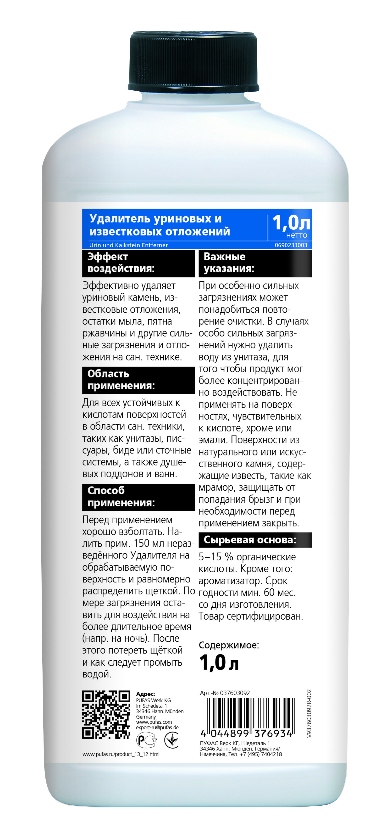Эффективно удаляет уриновый камень, известковые отложения, остатки мыла, пятна ржавчины и другие сильные загрязнения и отложения на сан. технике.