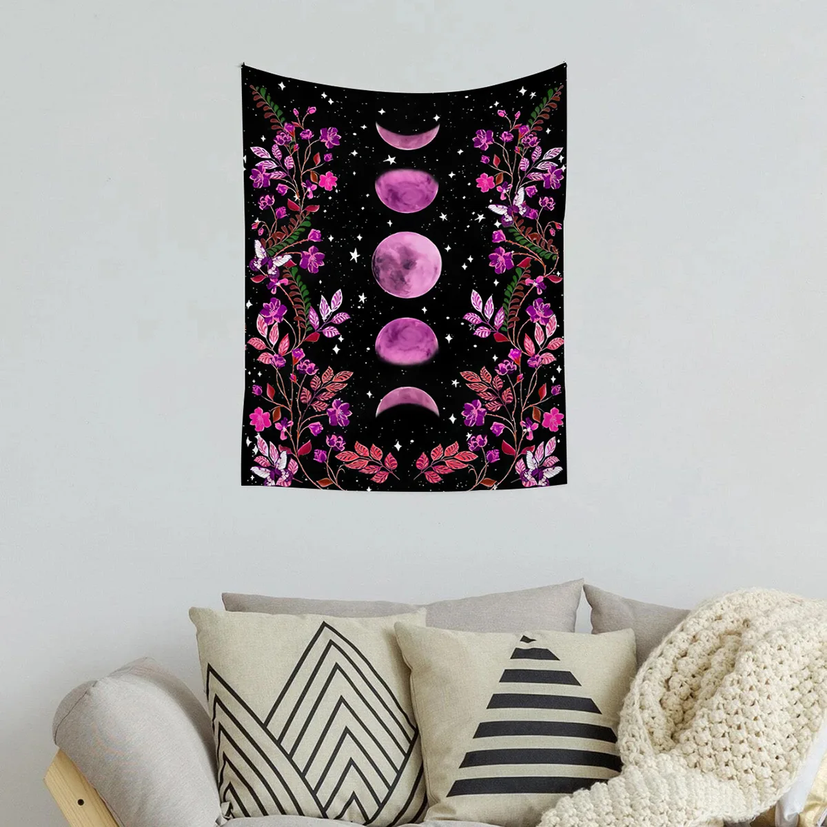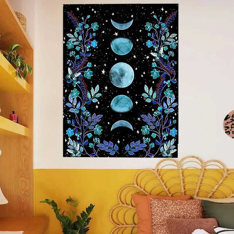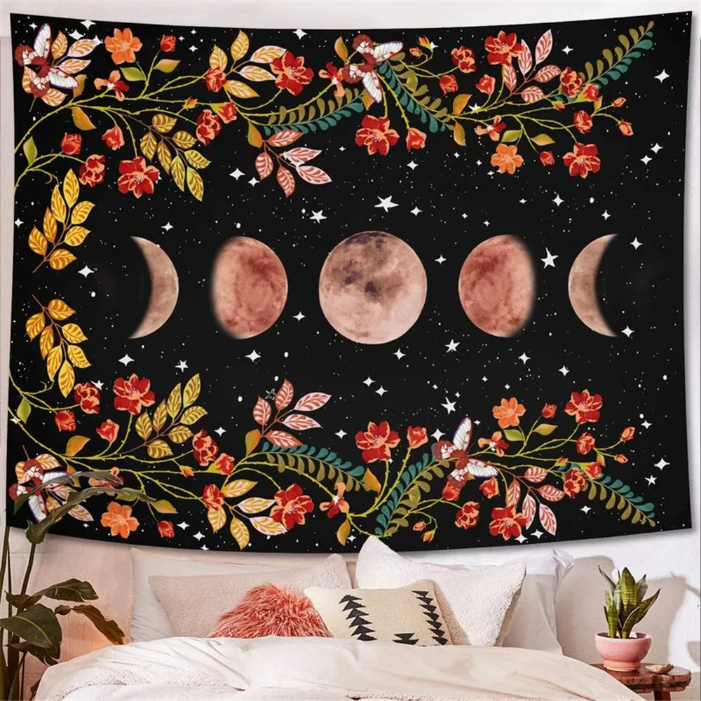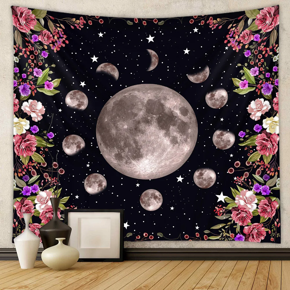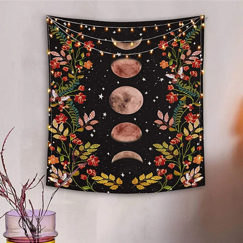 Гобелен с Луной, настенный гобелен в стиле бохо, гобелен с лунным светом для растений, Садовый гобелен, звездная ночь, ковер, черный фон, цветочный гобелен, Декор