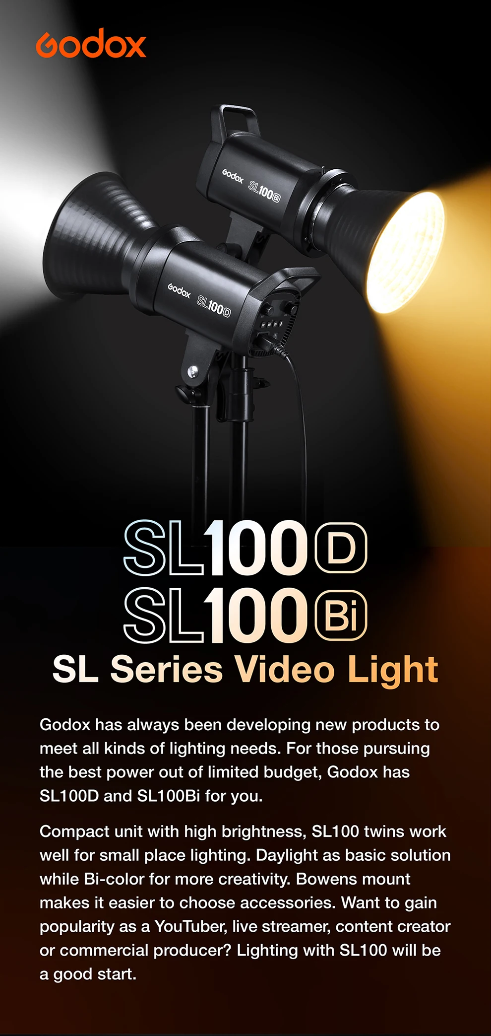 Godox всегда разрабатывает новые продукты для удовлетворения всех потребностей в освещении. Для тех, кто ищет лучшую мощность из ограниченного бюджета, у Godox есть SL100D и SL100Bi для вас.