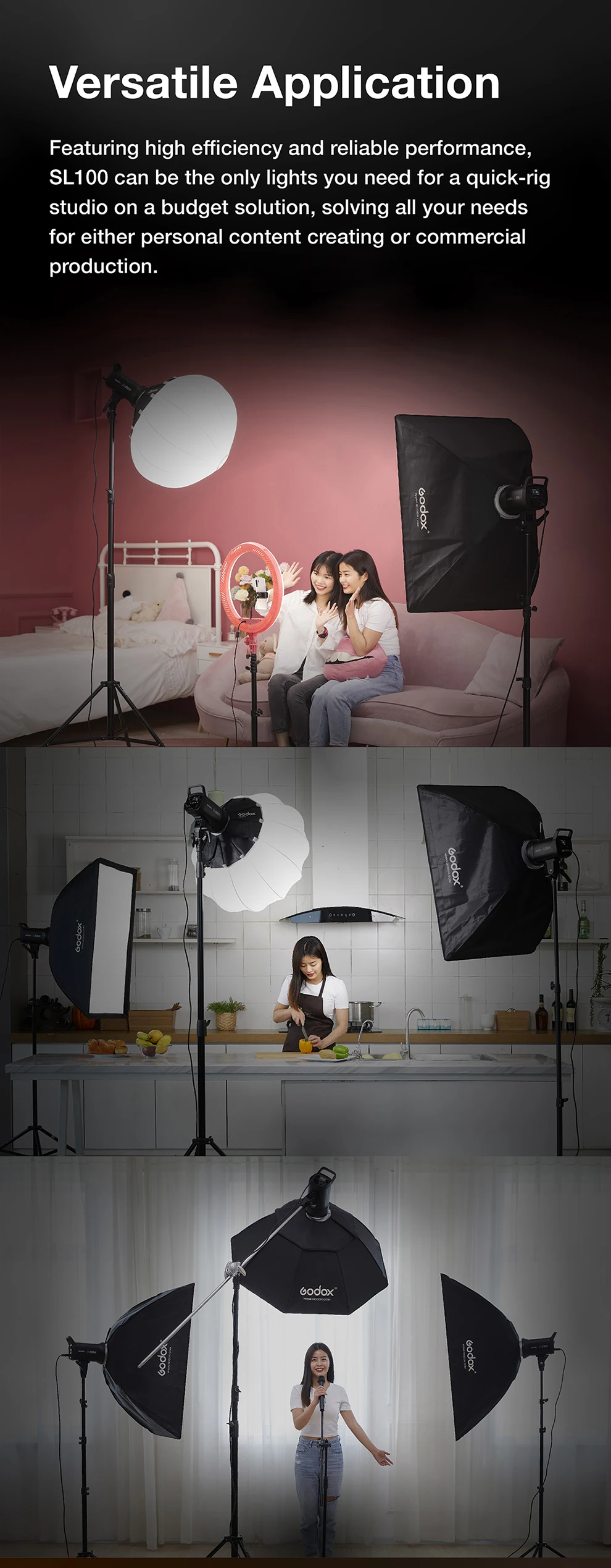 Благодаря высокой эффективности и надежной производительности, SL100 может быть единственным светильником, который вам нужен для студии быстрой установки на бюджетном решении, решая все ваши потребности как в создании личного контента, так и в коммерческом производстве.