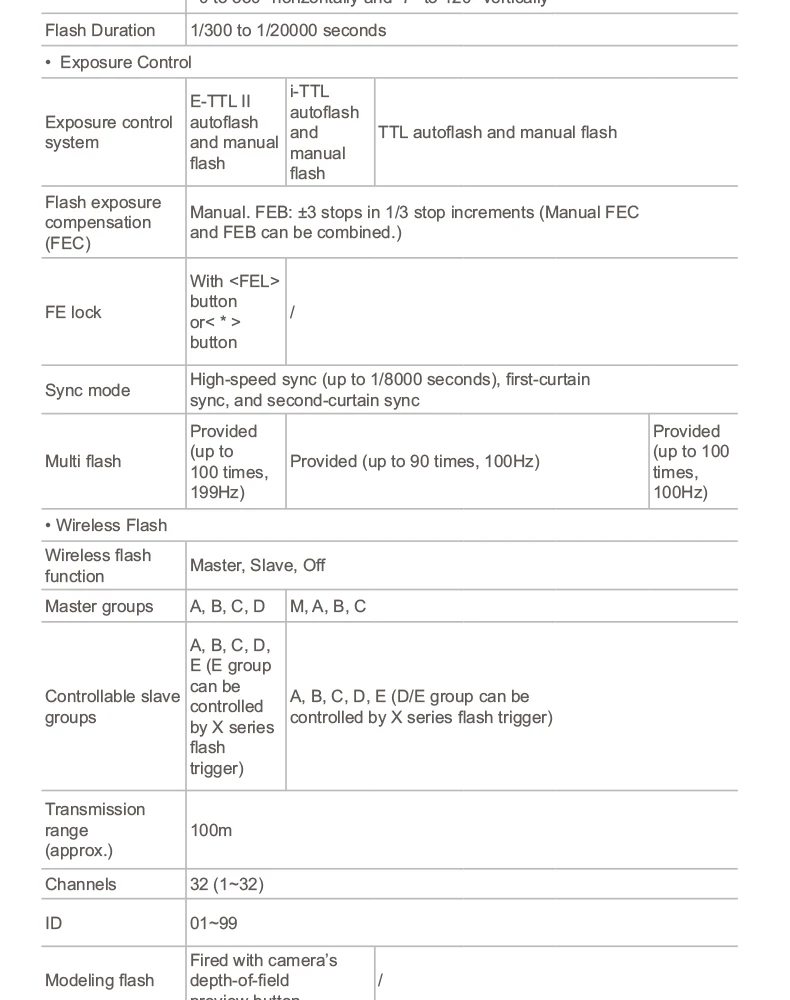 Совместимость с камерами серии Canon EOS, полная поддержка автоматической вспышки Canon E-TTL II, ручной вспышки, высокоскоростной синхронизации 1/8000 с, FEC,FEB,FEL, синхронизации по второй шторке и т. Д.