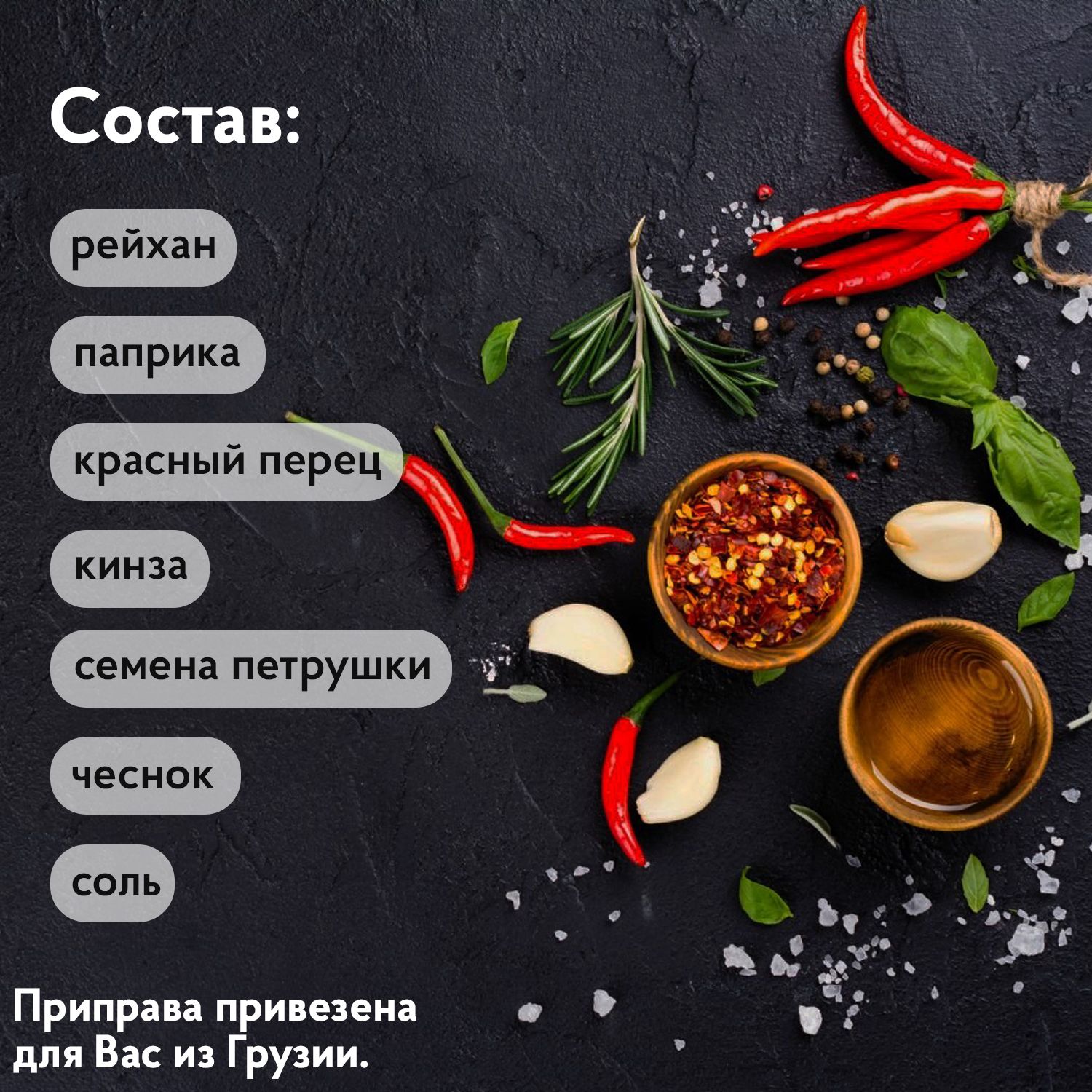 Рейхан, паприка, красный перец, кинза, семена петрушки, чеснок, соль.