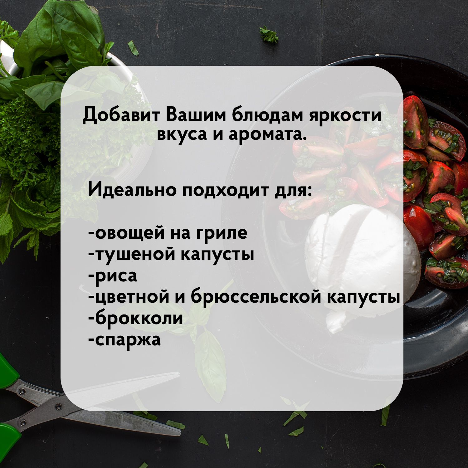 Назначение приправы: Для блюд из картофеля, Для блюд на гриле, Для вок-блюд, Для овощей, Для салатов, Для соусов, Универсальная
