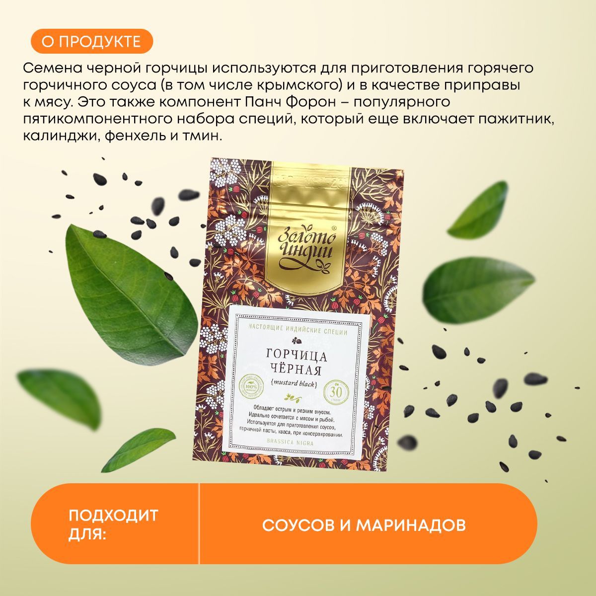Описание: Семена черной горчицы используются для приготовления горячего горчичного соуса (в том числе крымского) и в качестве приправы к мясу. Это также компонент Панч Форон – популярного пятикомпонентного набора специй, который еще включает пажитник, калинджи, фенхель и тмин.