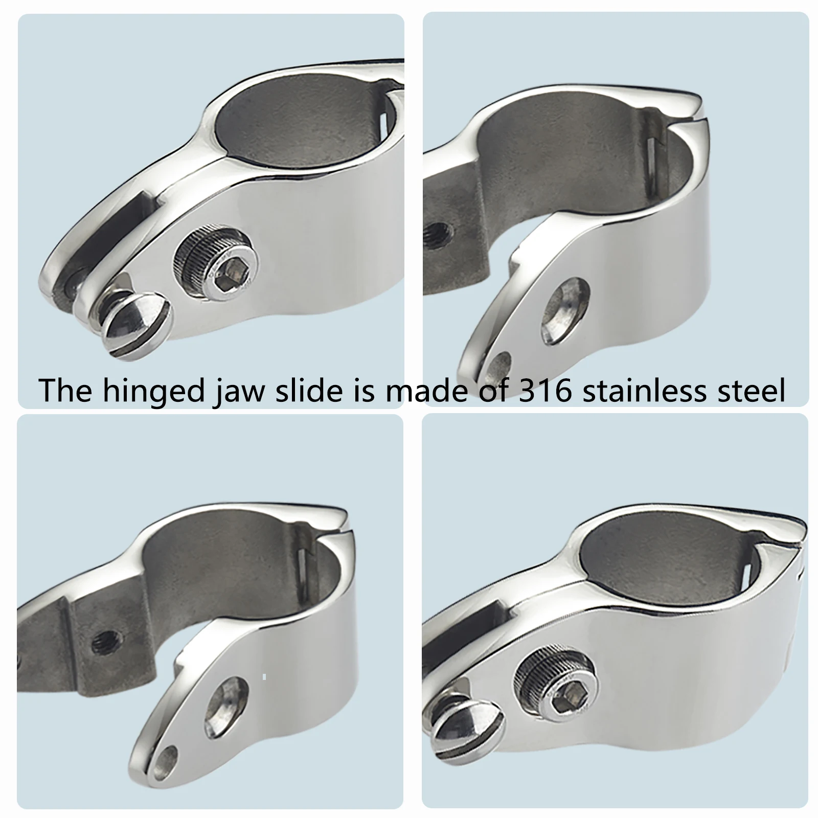• 【Без разборки】: Легко устанавливается на рейку, не разбирая раму. Просто Откройте челюсть, сдвиньте ее с рельса. Зафиксируйте его на рейке, закрепив винтами. Подходит для любого верха Bimini, Dodge и т. Д., Для которого требуются петли на рельсах.