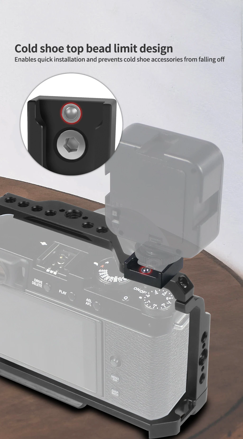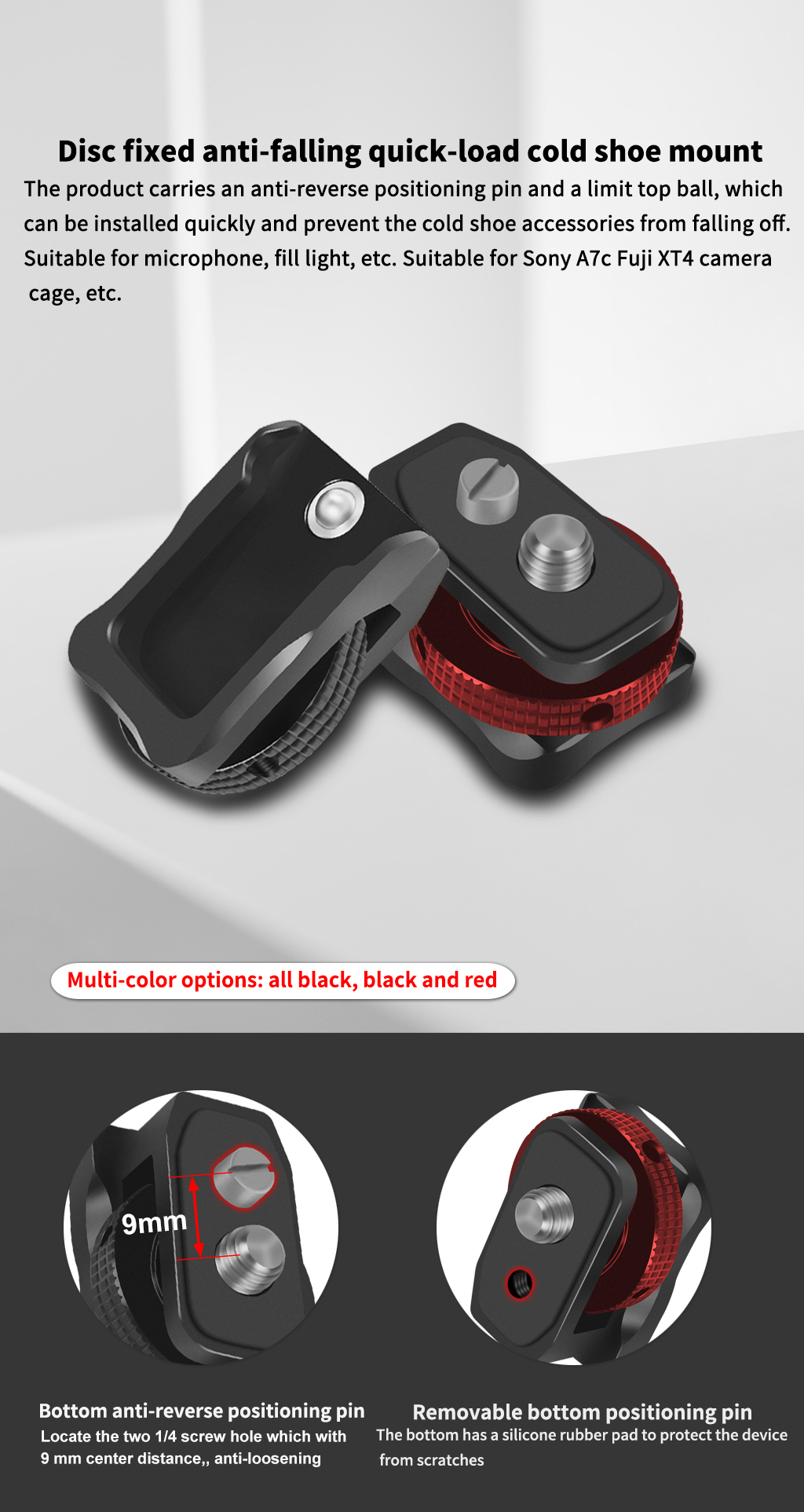 Подходит для расширения и установки адаптера холодного башмака на оборудование с отверстием для винта 1/4 дюйма, крепление для холодного башмака можно вращать Демпфирование на 360 ° по часовой стрелке;