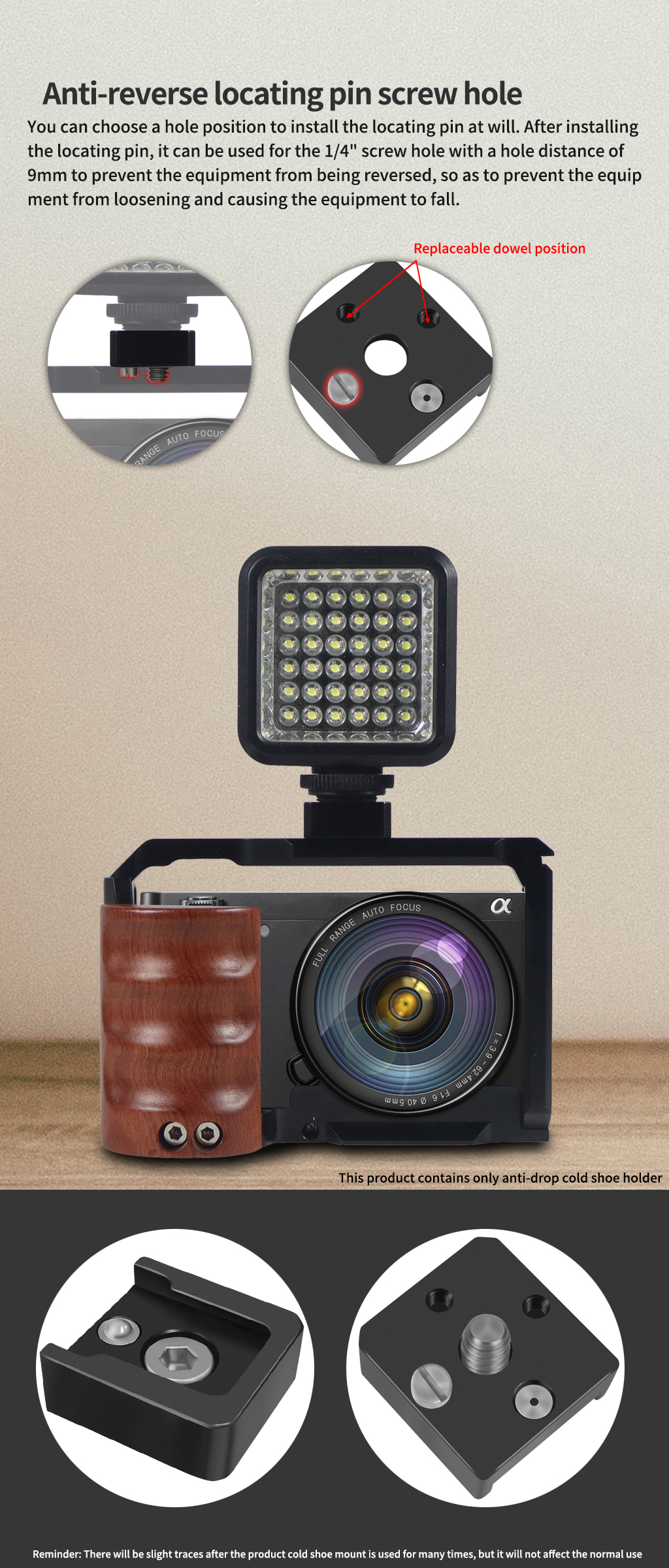 2. Есть 3 отверстия для винтов с защитой от обратного позиционирования с расстоянием между отверстиями 9 мм вокруг винта 1/4. После установки установочного штифта его можно использовать для 2 отверстий под винты 1/4 с расстоянием между отверстиями 9 мм, чтобы предотвратить обратное вращение и предотвратить ослабление оборудования и его падение.