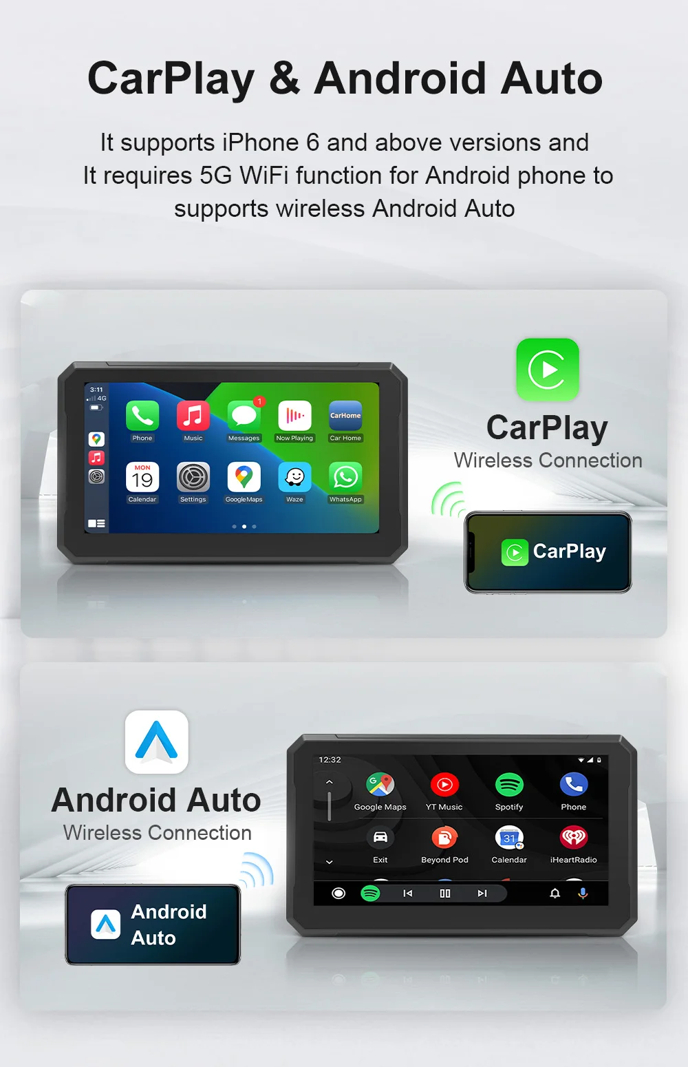 S7 Plus поддерживает версии iPhone 6 и выше, и для телефона Android требуется Функция 5G WiFi для поддержки беспроводной сети Android Auto.
