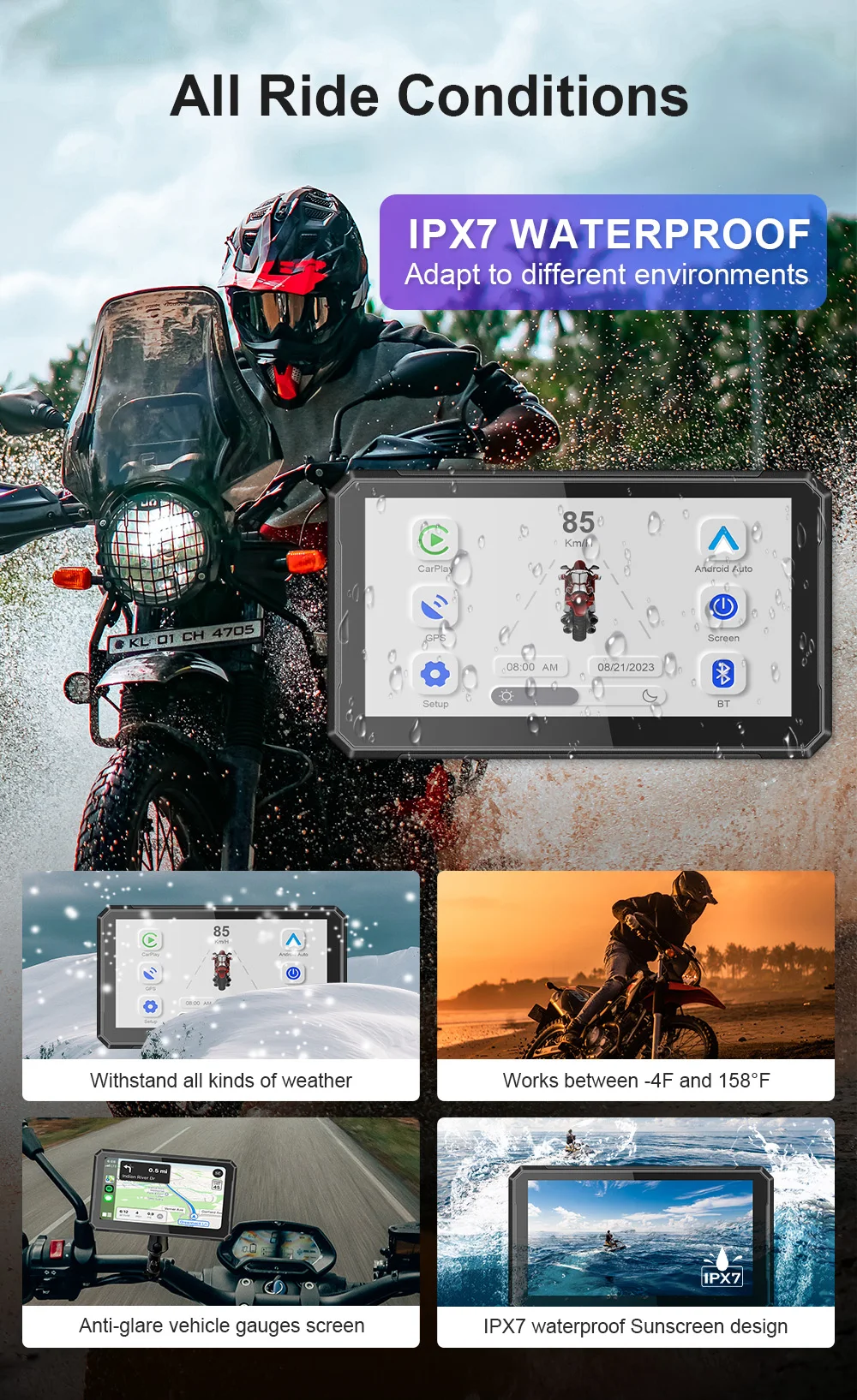 S7 может адаптироваться к различным погодным условиям и окружающей среде. Уровень водонепроницаемости IPX7 гарантирует нормальную работу в ливневую погоду. Антибликовый экран гарантирует, что он может четко отображаться при ярком солнечном свете. Он может нормально работать при температурах от-4 ° F до 158 ° F.