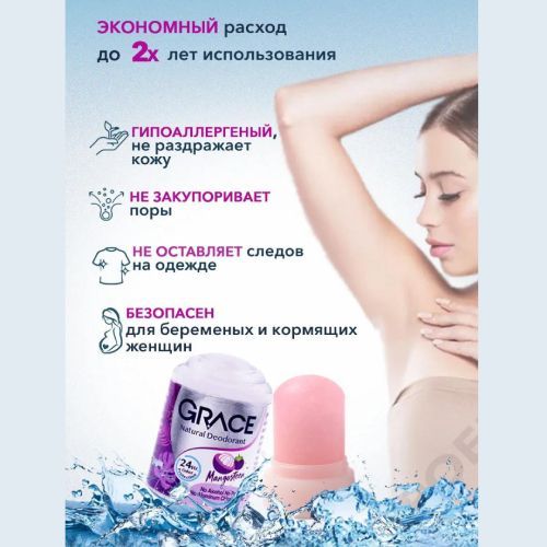 • Тайский дезодорант кристалл Grace (Грейс) мангостин — природный дезодорант, состоящий из исключительно натуральных компонентов. Работает за счет минеральных солей, обладающих естественным антибактериальным действием, и не допускает возникновения неприятного запаха.