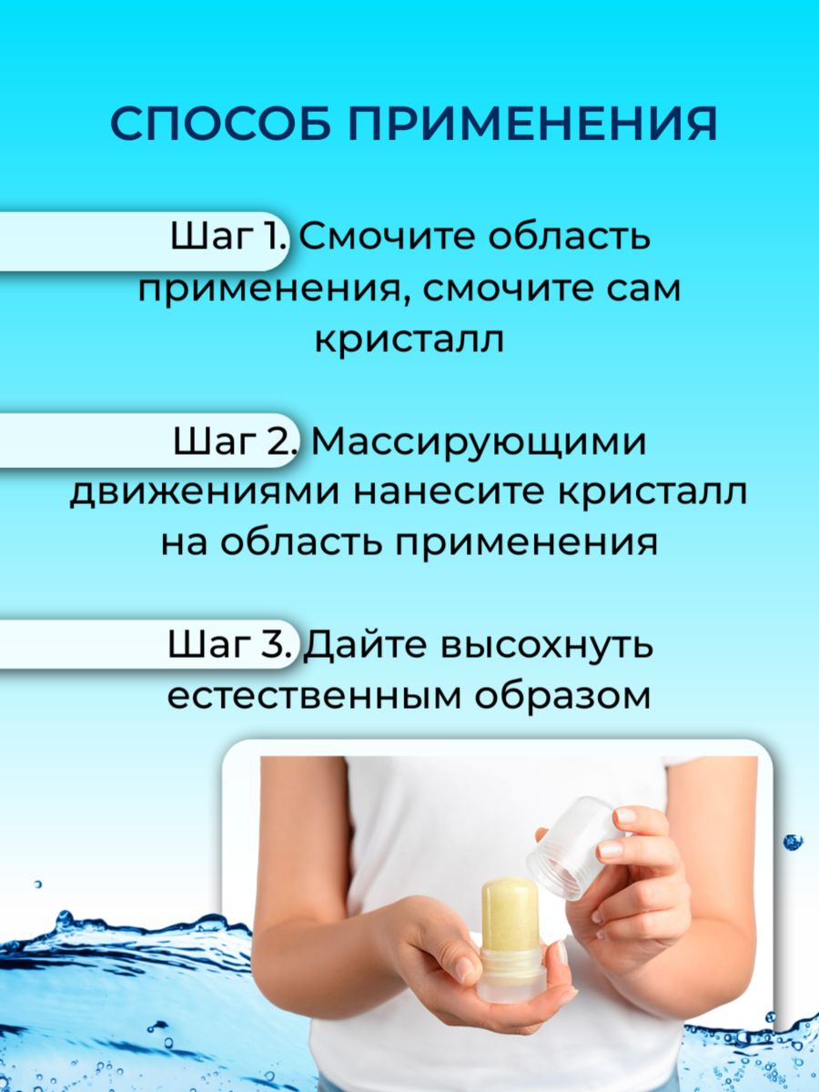 Описание: Grace Дезодорант кристаллический натуральный Свежесть. Защищает от пота и неприятного запаха без закупорки потовых протоков, обладает антибактериальным эффектом, поскольку борется с бактериями, являющимися причинами появления запаха, экономичен, обладает длительным периодом действия, не оставляет следов на одежде, не раздражает кожу. Поверхность кристалла, растворяясь в воде, покрывает тончайшим налетом вашу кожу, надежно защищая ее от бактерий. Кристалл по мере использования постепенно уменьшается в размерах, но сохраняет свою эффективность до полного своего исчезновения. Способ применения: намочите кристалл водой и протрите им подмышки и стопы после утреннего душа.