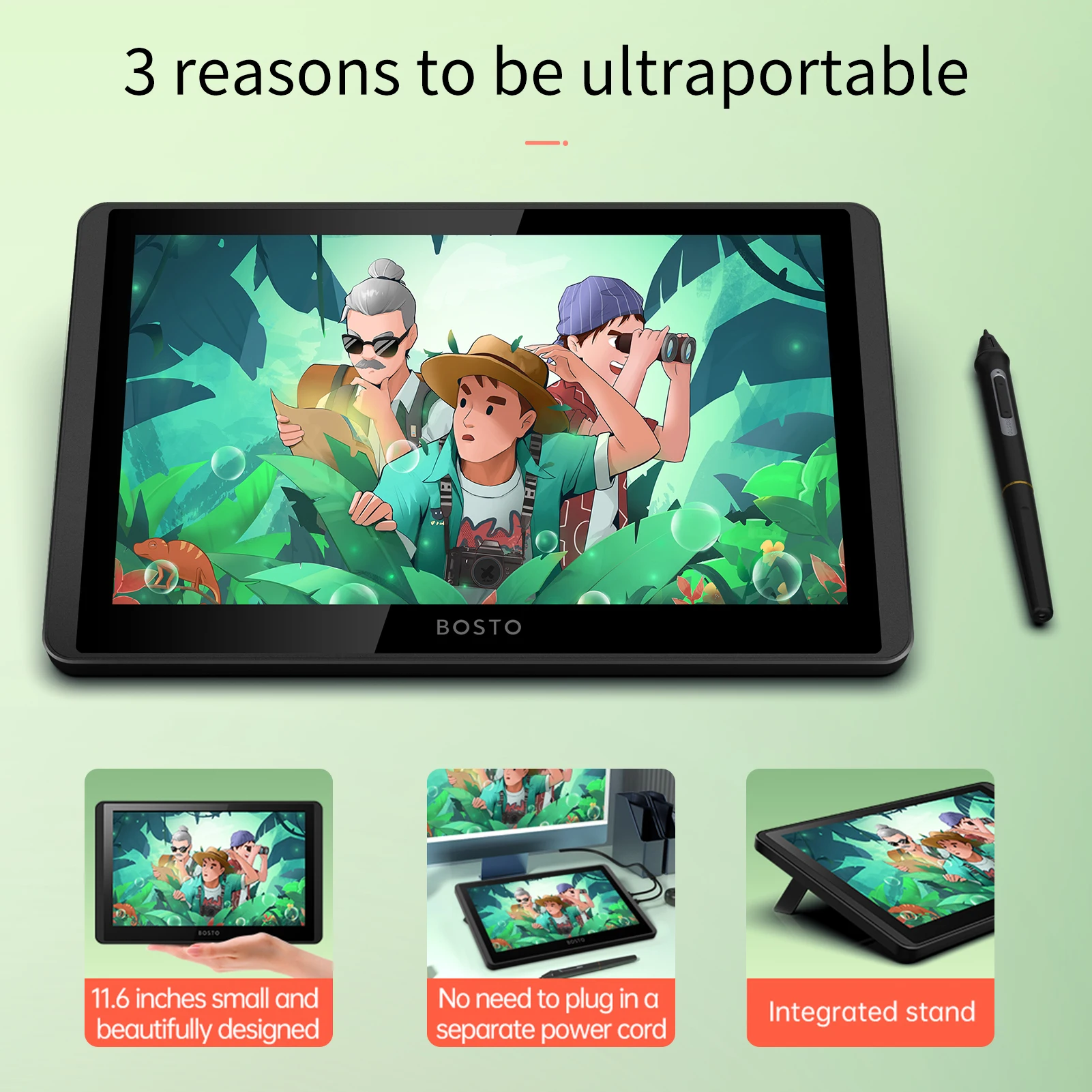 Графический планшет BOSTO 12HD-A H-IPS для рисования, 11,6 дюйма, размер 1366x76, 8 дисплеев, уровень давления 8192, Пассивная технология