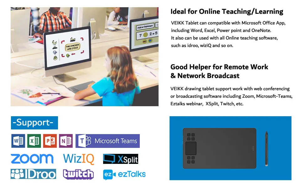 Хороший помощник для удаленной работы и сетевой трансляции. Планшет VEIKK для рисования поддерживает работу с веб-конференции или программным обеспечением для вещания, включая Zoom, Microsoft-Team, Eztalks webinar, XSplit, Twitch и т. д.