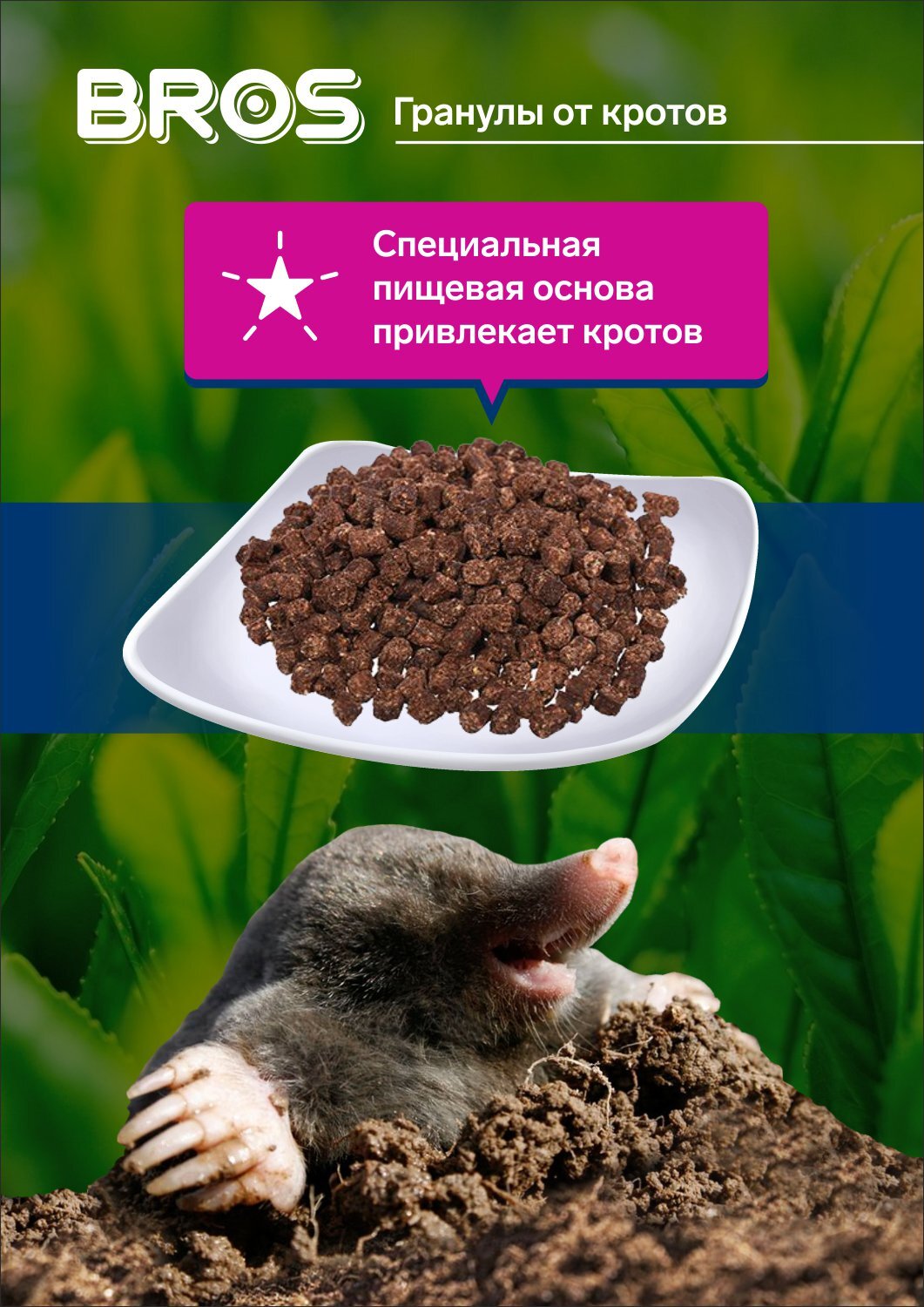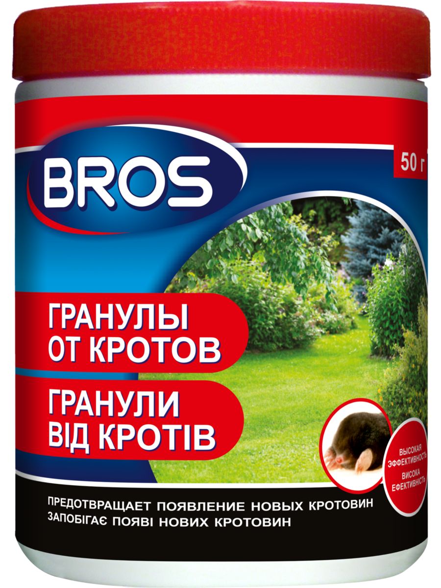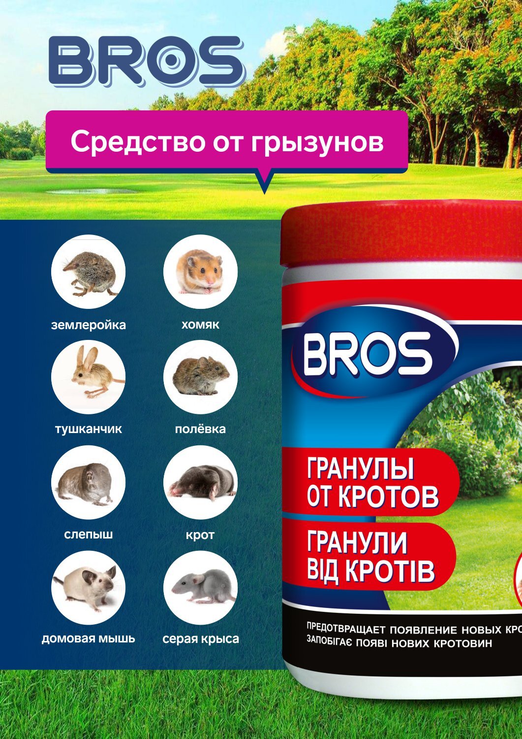 Описание: Гранулы от кротов Bros - это специальная пищевая приманка, состав этой приманки подобран с учетом пищевых предпочтений кротов и землероек, запах и вкус очень привлекательны для данного животного. Специальная технология изготовления и включение в состав сильного действующего вещества (до 10% хлоралоза) гарантируют высокую эффективность в борьбе с кротами, землеройками, мышами и крысами.