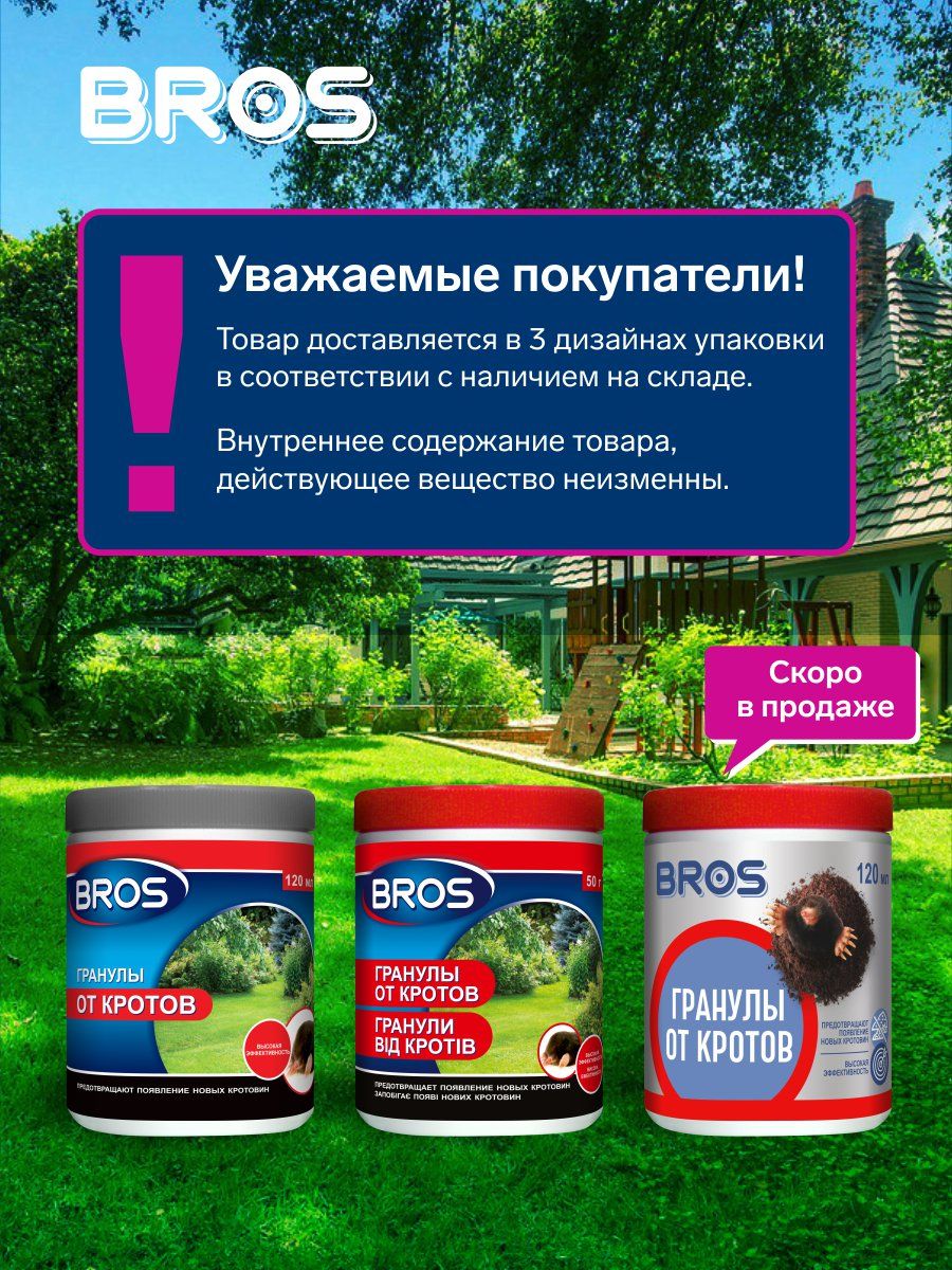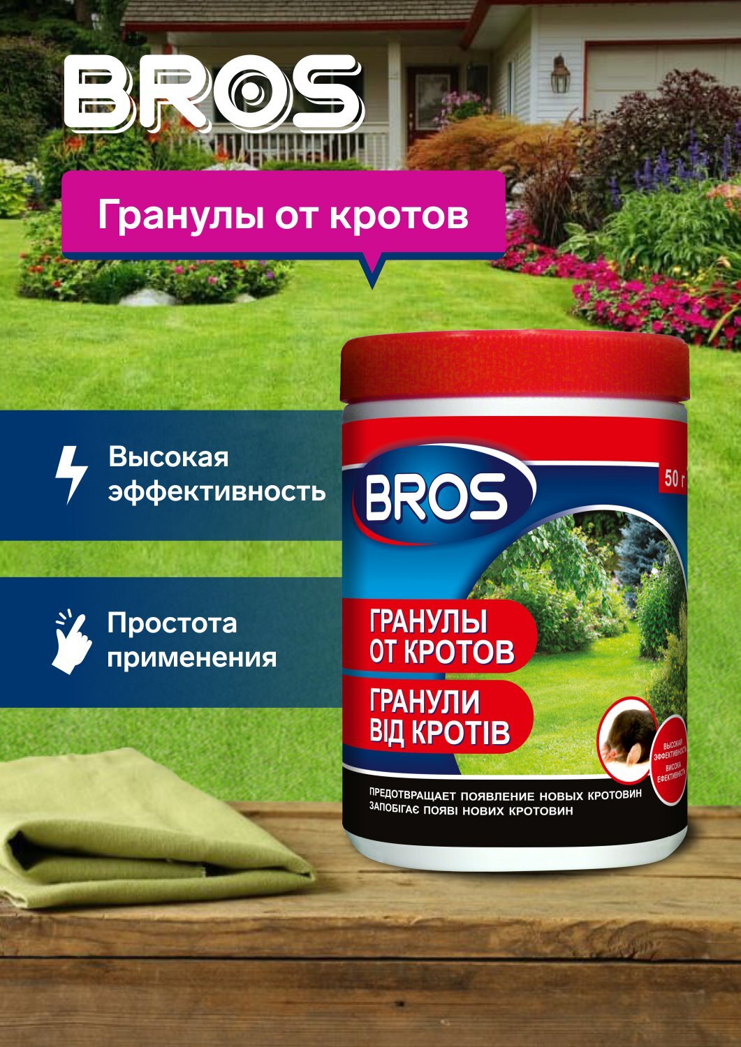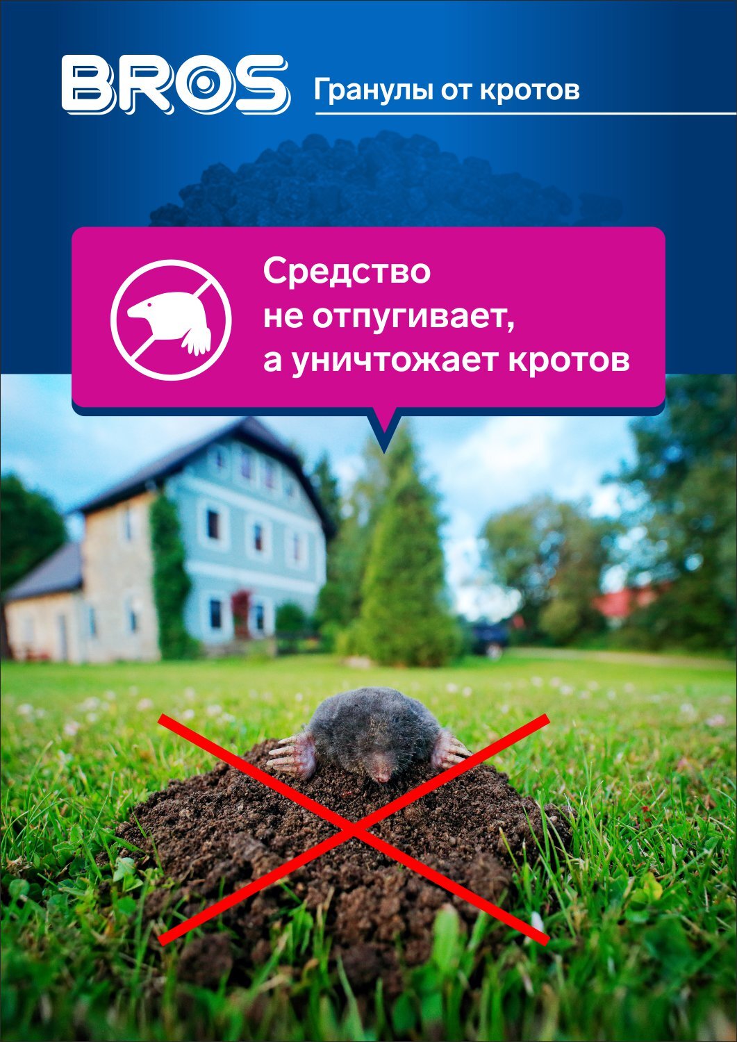 Описание: Гранулы от кротов Bros - это специальная пищевая приманка, состав этой приманки подобран с учетом пищевых предпочтений кротов и землероек, запах и вкус очень привлекательны для данного животного. Специальная технология изготовления и включение в состав сильного действующего вещества (до 10% хлоралоза) гарантируют высокую эффективность в борьбе с кротами, землеройками, мышами и крысами.