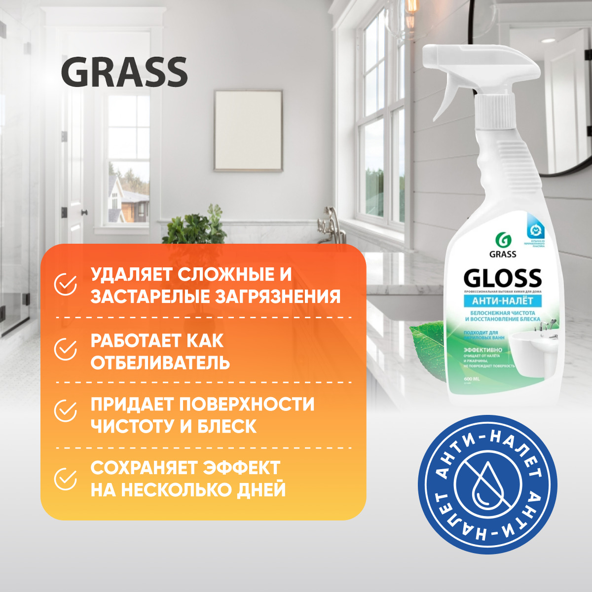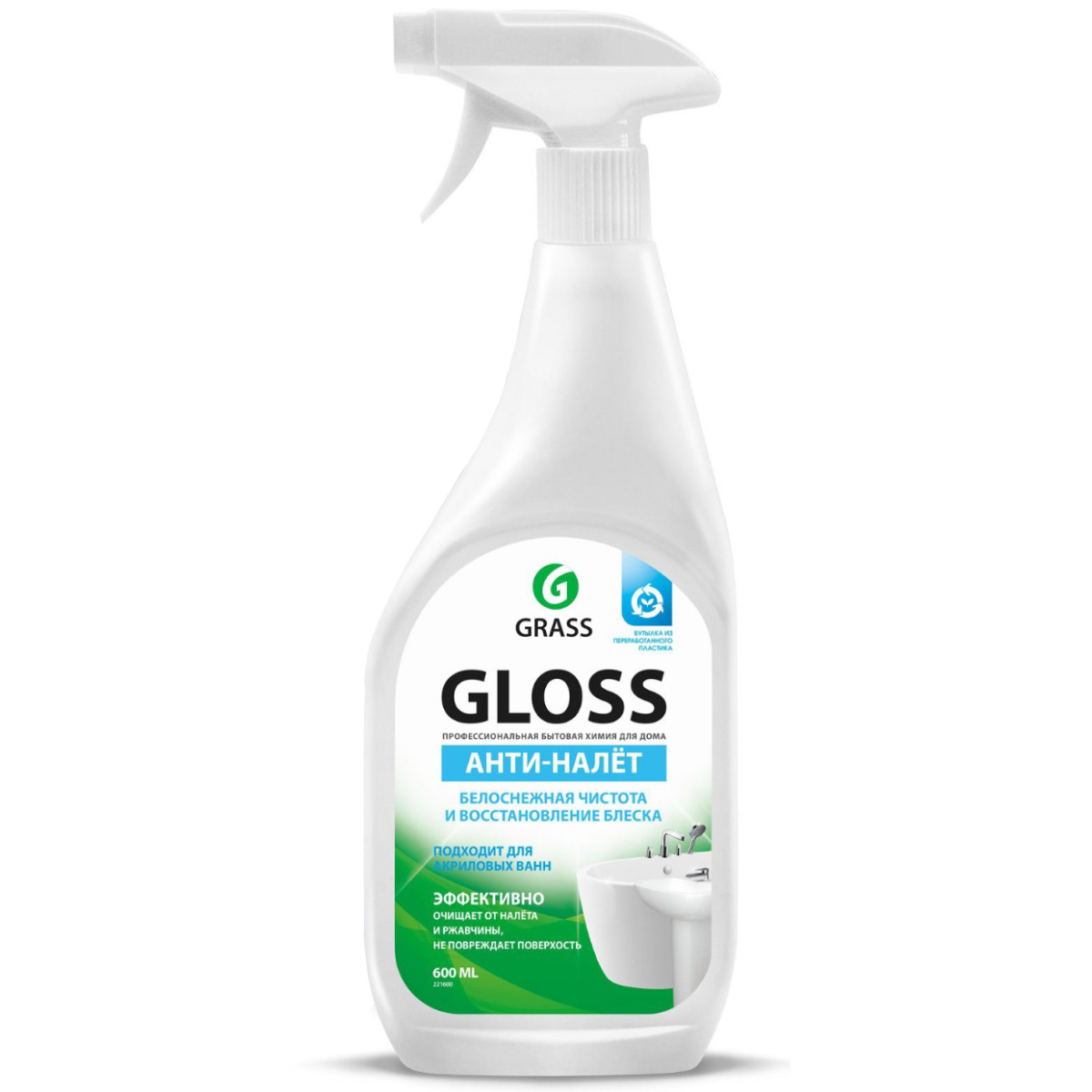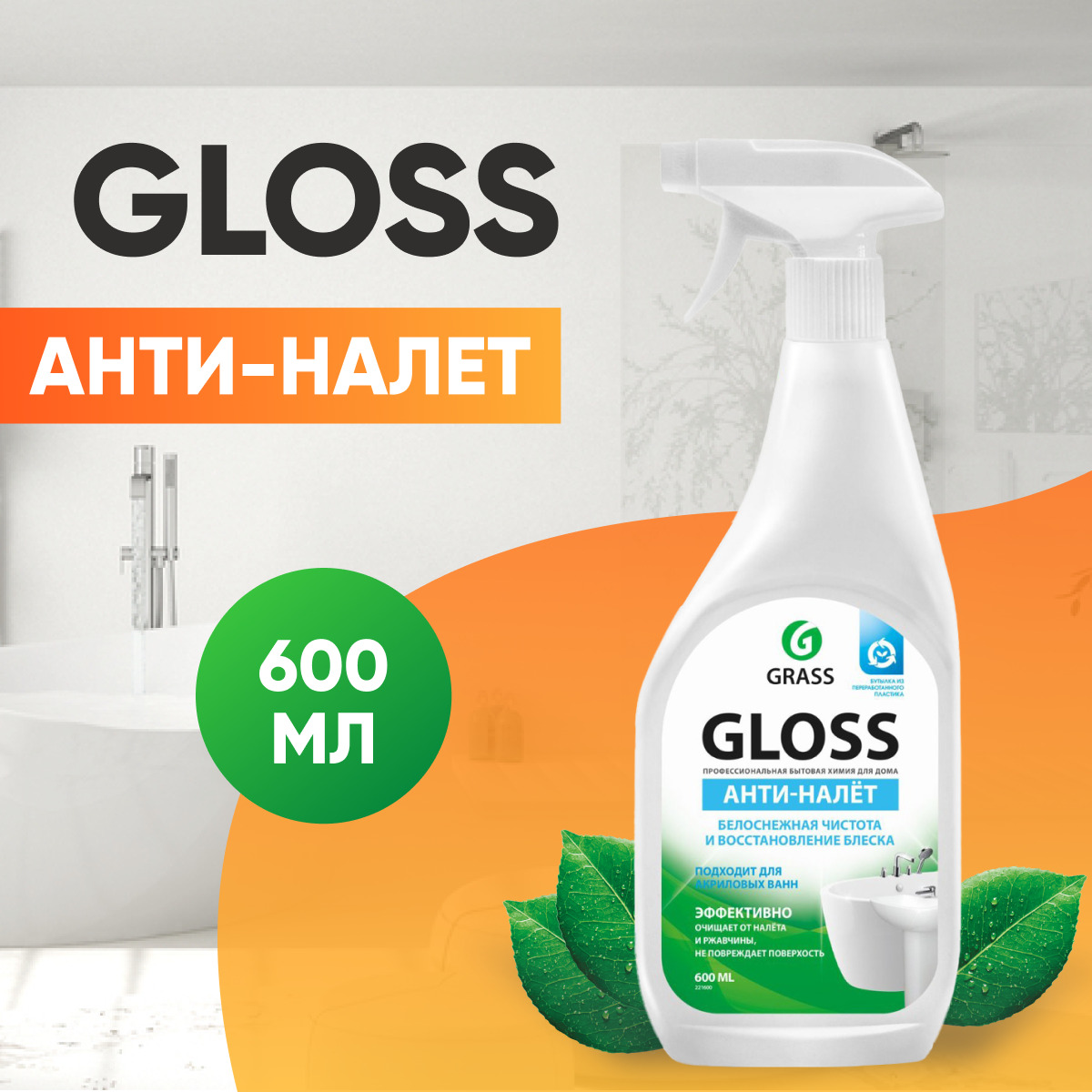 GRASS Универсальное чистящее средство для ванной комнаты и туалета Gloss / ГРАСС Глосс Анти-налет, 600 мл
