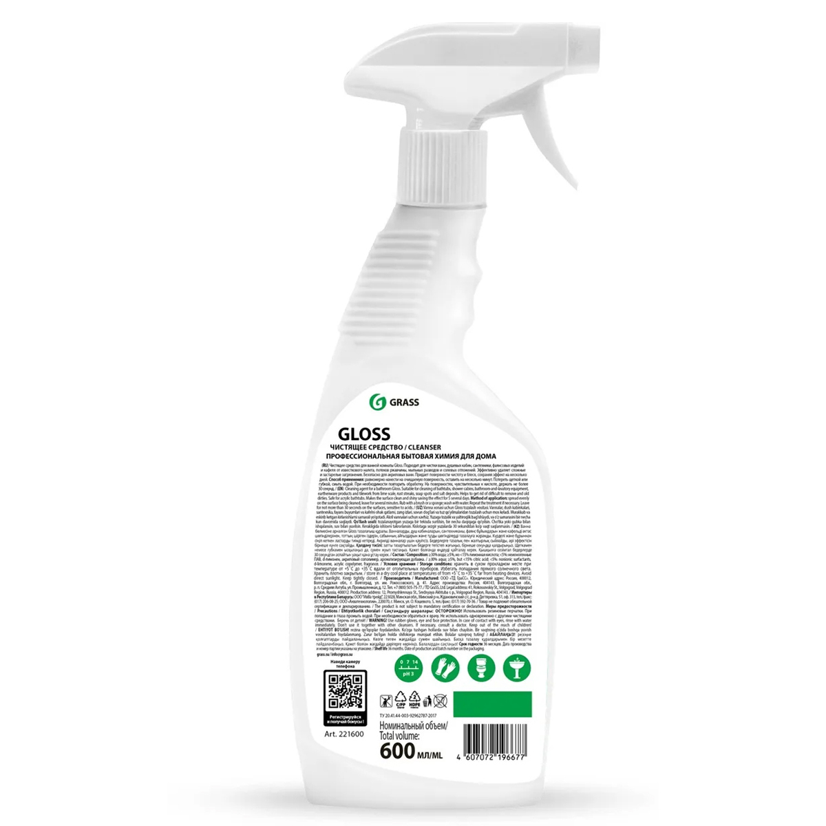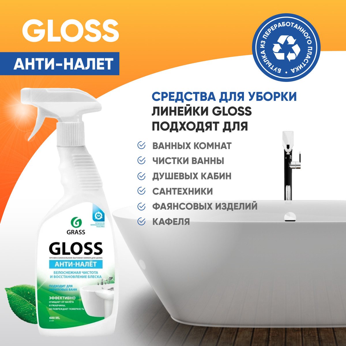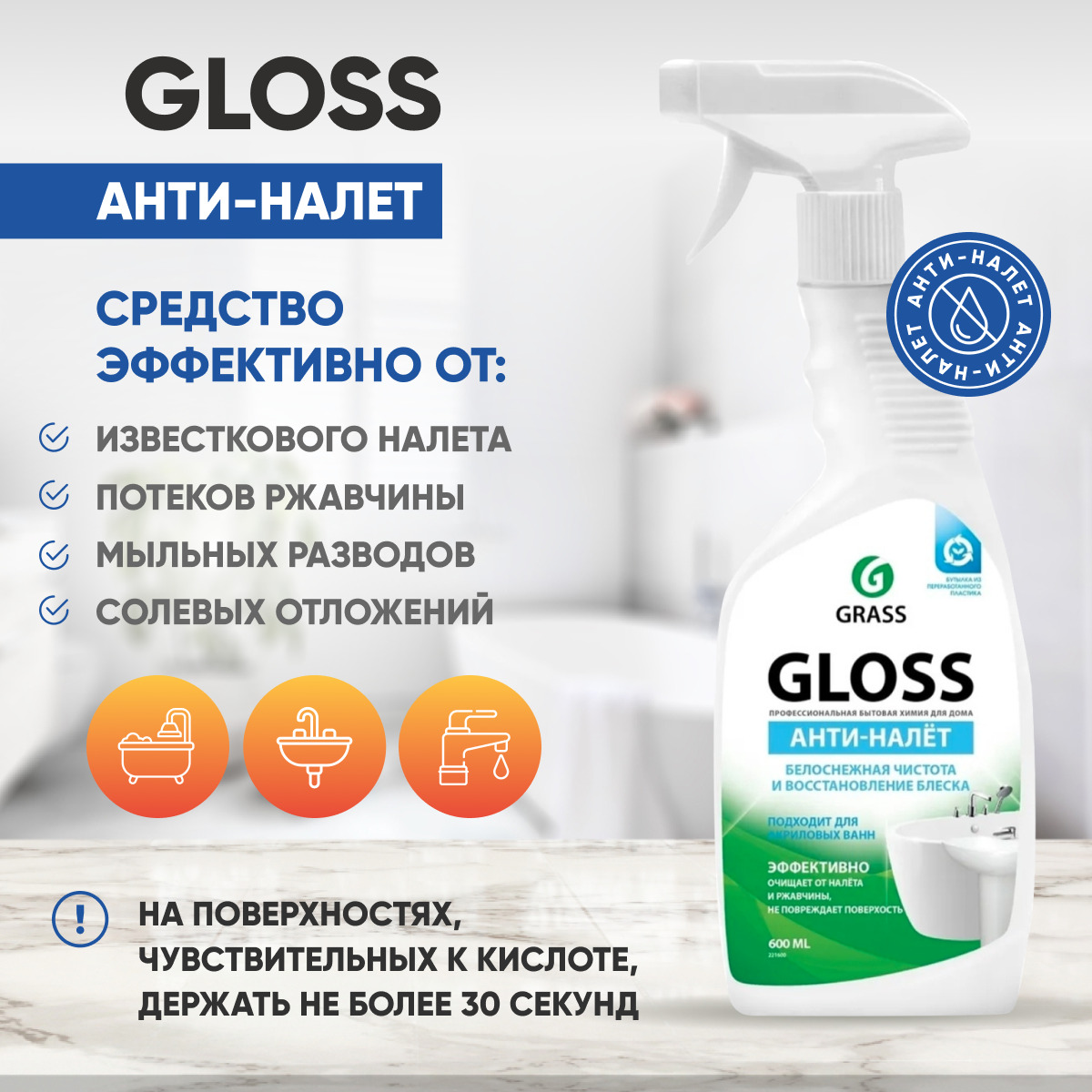 GRASS Универсальное чистящее средство для ванной комнаты и туалета Gloss / ГРАСС Глосс Анти-налет, 600 мл
