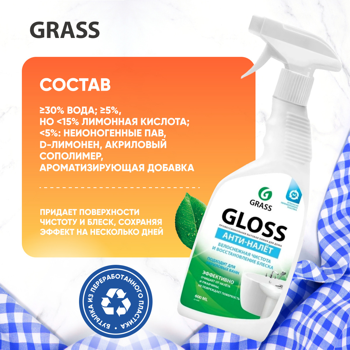 Текст при отключенной в браузере загрузке изображенийДеликатное очищениеGRASS Gloss подходит для изделий из акрила. Он деликатно воздействует на поверхность, не повреждая ее. После применения средства блеск и чистота акрилового изделия сохраняются в течение нескольких дней.