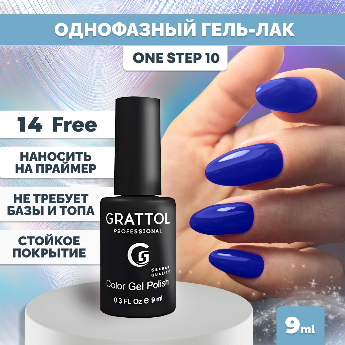 Grattol гель-лак для ногтей однофазный, без базы, без топа синий One Step 10, 9 мл