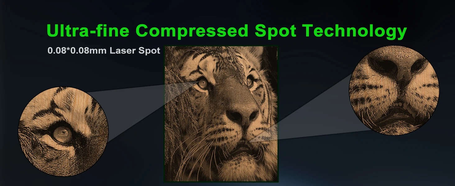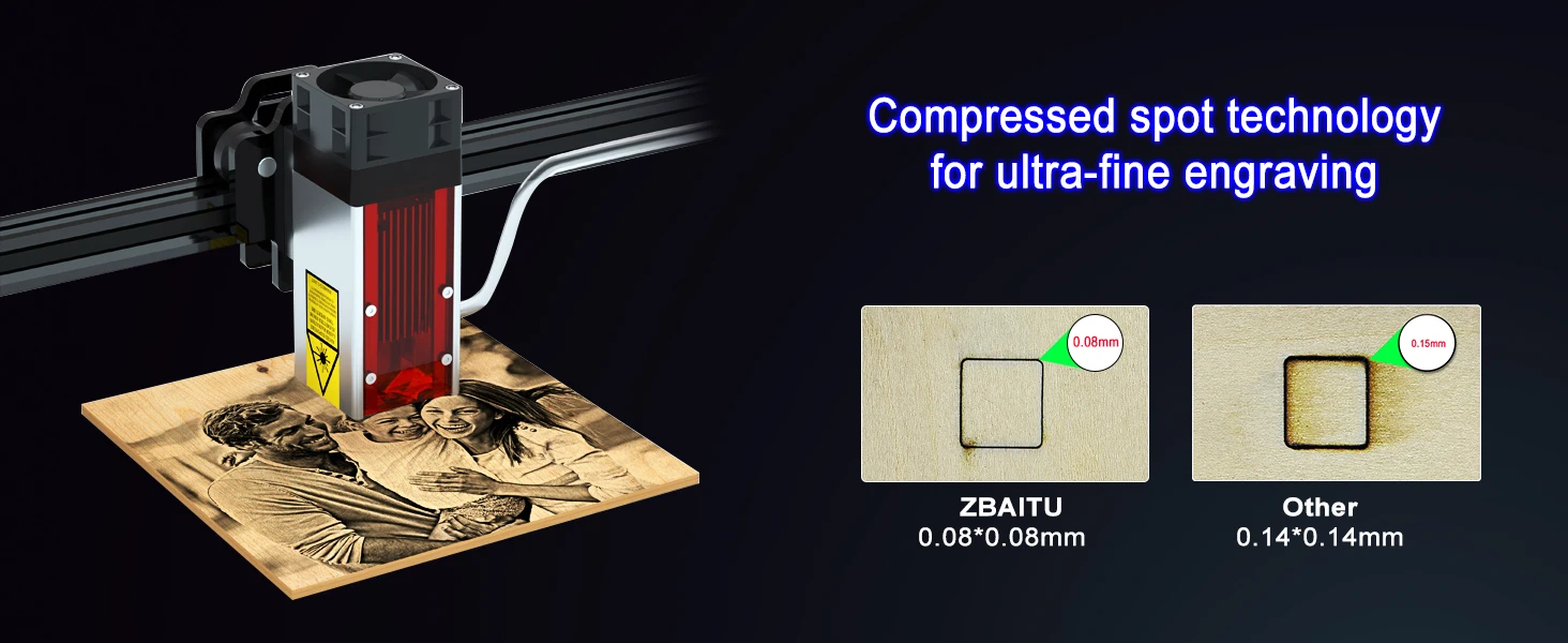 Высокая точность резки и гравировки:Лазерный гравер ZBAITU использует инновационную двойную лазерную технологию для объединения 2 лазерных лучей в ультратонкое лазерное пятно 0,08*0,08 мм. Обжатое пятно имеет более высокую мощность и режущую способность, более высокую скорость и лучший эффект при той же электроэнергии.