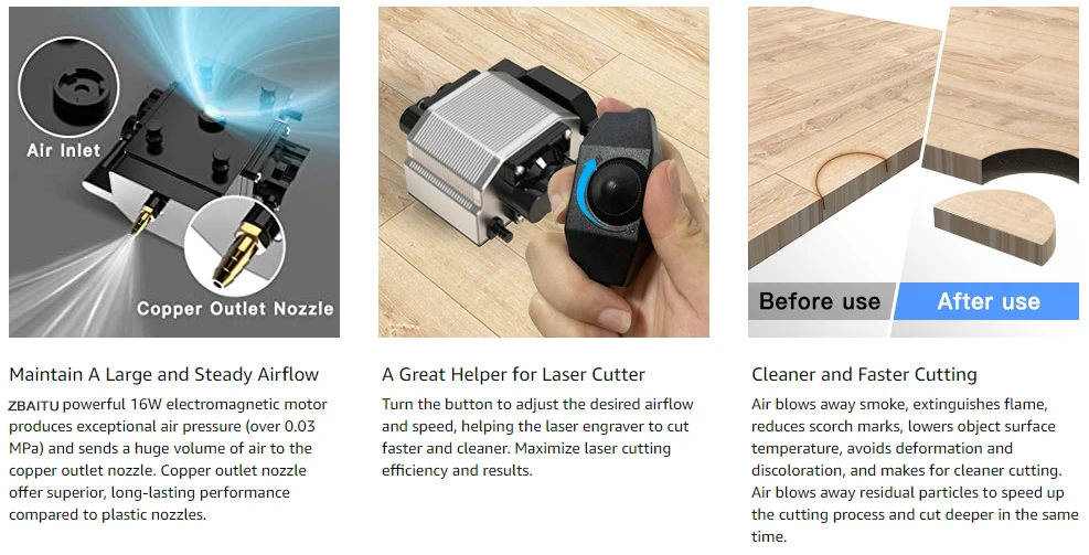 2. Он уменьшает потери мощности лазера, отталкивая дым и остатки от материала, поэтому ваша Лазерная работа может быть выполнена быстрее с улучшенной отделкой.