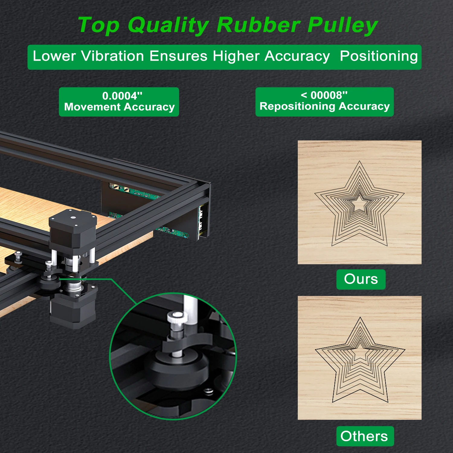 Передовая лазерная технология:Новейшая лазерная машина для резки гравера, с эффективной мощностью 80 Вт, выходная мощность лазерного модуля 10 Вт. Сжатое пятно и пятно фокусировки лазера делают лазерный гравер более мощным и точным. Он может чисто отрезать древесину толщиной 10 мм и темный акрил 8 мм за один проход, скорость гравировки может быть до 9600 мм/мин.