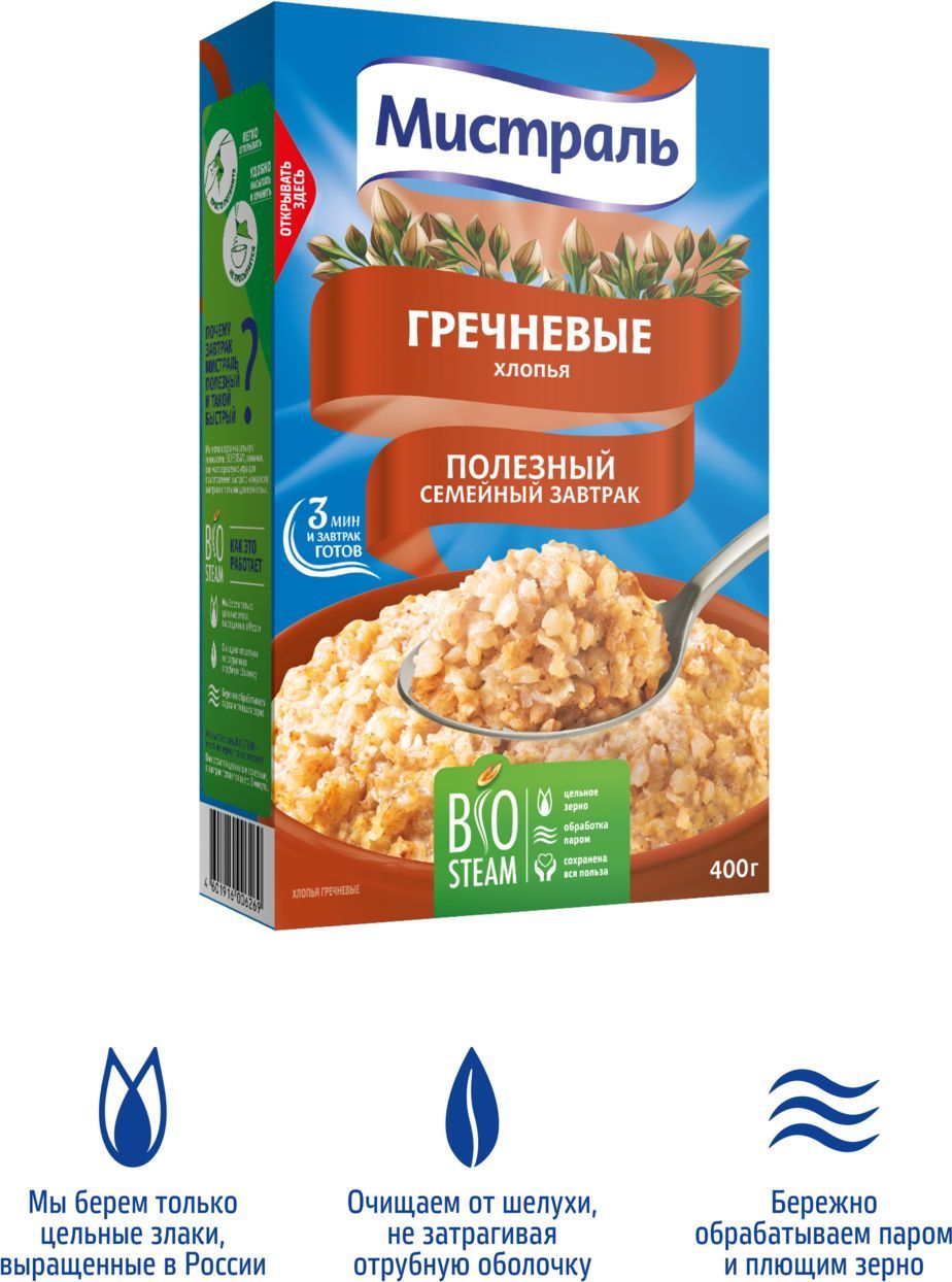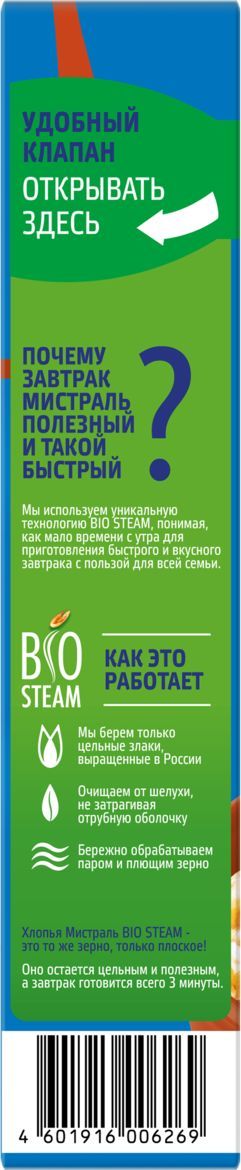 Описание: Секрет натуральности хлопьев Мистраль прост: наши хлопья — это то же зерно, только плоское. Мы закупаем злаки в оптимальных для них климатических зонах России, очищаем от шелухи, не затрагивая отрубевую оболочку, пропариваем под давлением и расплющиваем. Зерно остается цельным и не теряет своих природных свойств. Теперь можно приготовить полезный горячий завтрак, потратив лишь несколько минут.