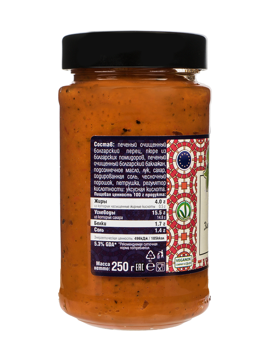 печеный очищенный болгарский перец, пюре из болгарских помидоров, печеный очищенный болгарский баклажан, подсолнечное масло, лук, сахар, йодированная соль, чесночный порошок, петрушка, регулятор кислотности: уксусная кислота