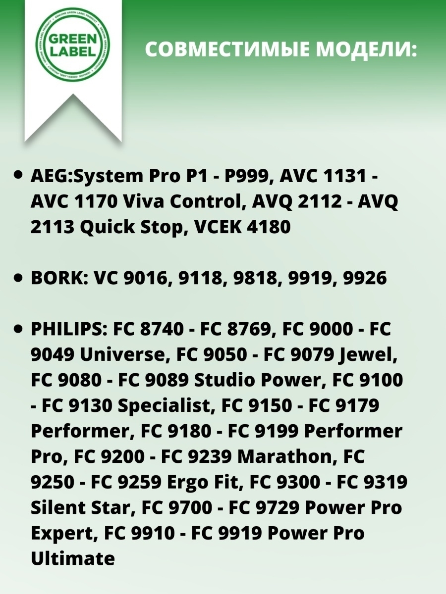 • PHILIPS: FC 8740 - FC 8769, FC 9000 - FC 9049 Universe, FC 9050 - FC 9079 Jewel, FC 9080 - FC 9089 Studio Power, FC 9100 - FC 9130 Specialist, FC 9150 - FC 9179 Performer, FC 9180 - FC 9199 Performer Pro, FC 9200 - FC 9239 Marathon, FC 9250 - FC 9259 Ergo Fit, FC 9300 - FC 9319 Silent Star, FC 9700 - FC 9729 Power Pro Expert, FC 9910 - FC 9919 Power Pro Ultimate
