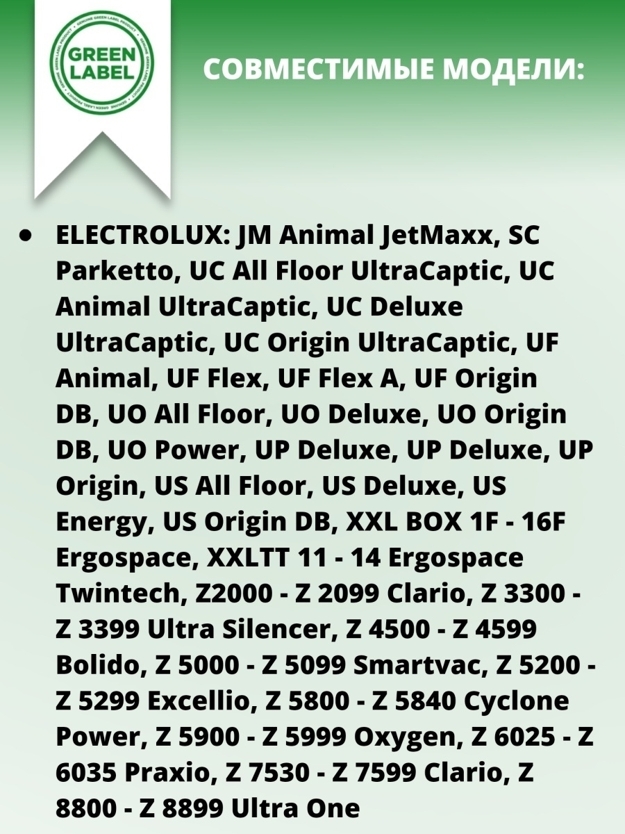 • ELECTROLUX: JM Animal JetMaxx, SC Parketto, UC All Floor UltraCaptic, UC Animal UltraCaptic, UC Deluxe UltraCaptic, UC Origin UltraCaptic, UF Animal, UF Flex, UF Flex A, UF Origin DB, UO All Floor, UO Deluxe, UO Origin DB, UO Power, UP Deluxe, UP Deluxe, UP Origin, US All Floor, US Deluxe, US Energy, US Origin DB, XXL BOX 1F - 16F Ergospace, XXLTT 11 - 14 Ergospace Twintech, Z2000 - Z 2099 Clario, Z 3300 - Z 3399 Ultra Silencer, Z 4500 - Z 4599 Bolido, Z 5000 - Z 5099 Smartvac, Z 5200 - Z 5299 Excellio, Z 5800 - Z 5840 Cyclone Power, Z 5900 - Z 5999 Oxygen, Z 6025 - Z 6035 Praxio, Z 7530 - Z 7599 Clario, Z 8800 - Z 8899 Ultra One, Z 90 Ultra One, ZAC 6700 - ZAC 6899 Accelerator, ZAM 6200 - ZAM 6299 Air Max, ZAP Origin W, ZCS 2000 - ZCS 2590 Classic Silence, ZCX 6200 - ZCX 6499 Cyclone XL, ZE 300 - ZE 390 New Ergospace, ZE 2200 - ZE 2299 Ergospace, ZEO 5400 - ZEO 5490 Essensio, ZJM 6800 - ZJM 6890 Jet Maxx, ZO 6300 -ZO 6399 Oxy3system, ZSC 6900 - ZSC 6990 Super Cyclone, ZUA 3800 - ZUA 3890 Ultra Active, ZUO All Floor, ZUO Deluxe, ZUO Origin DB, ZUO Power, ZUO Quattro, ZUP 3800 - ZUP 3890 Ultra Performer, ZUS 3300 - ZUS 3390 Ultra Silencer, ZUS 3900 -ZUS 3990 New Ultra Silencer, ZXM 7010 - ZXM 7090 MAXimus