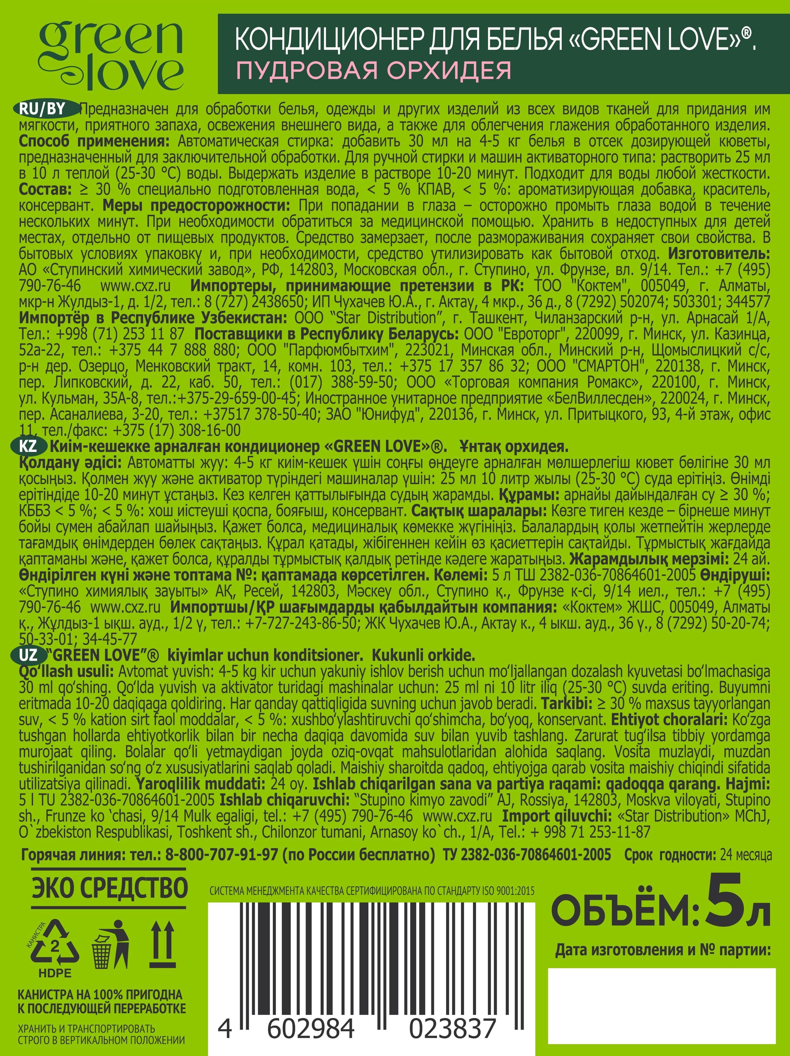 GREEN LOVE кондиционер для белья, Пудровая орхидея, 5 л