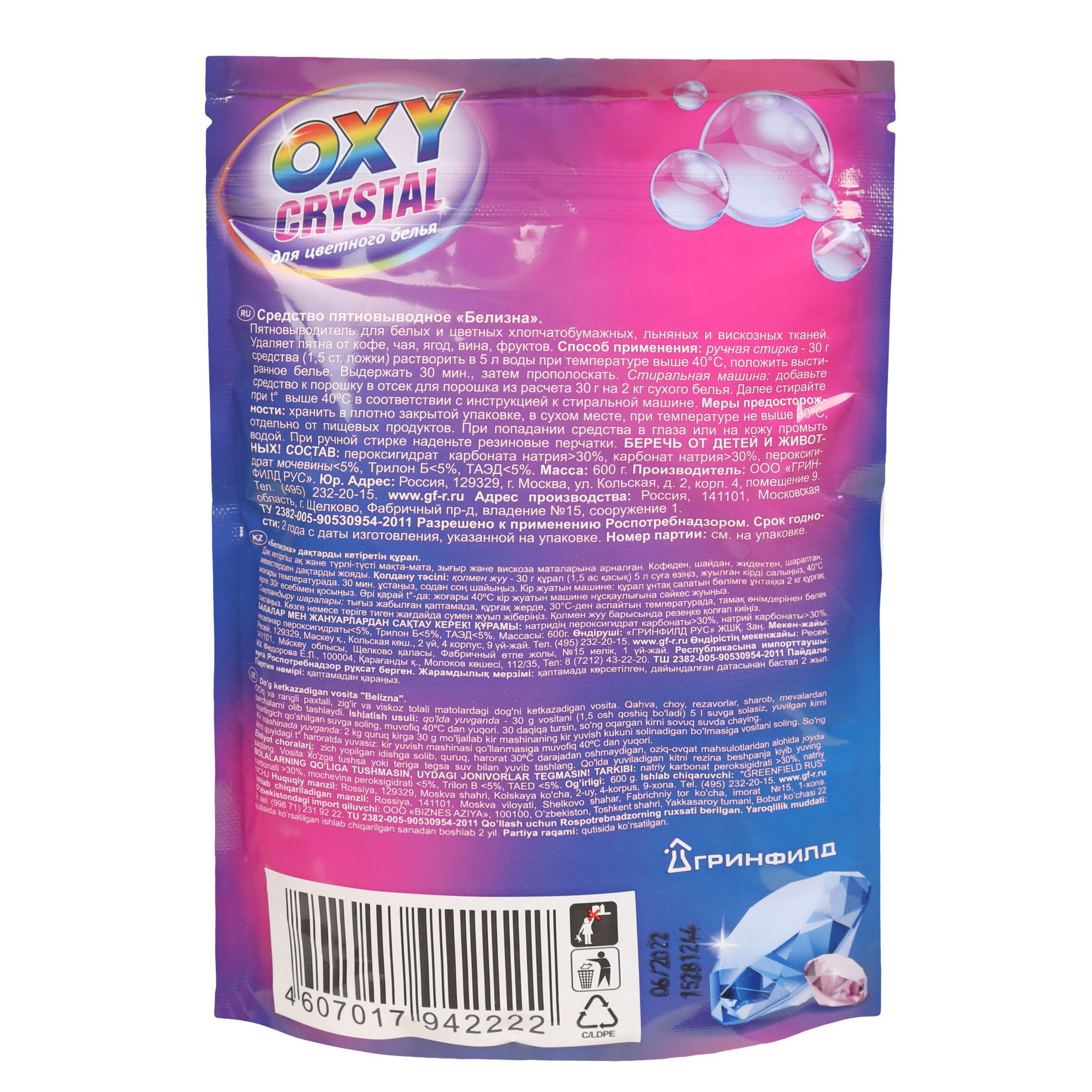 GreenField Кислородный отбеливатель пятновыводитель Oxy crystal для цветного белья 600 г.