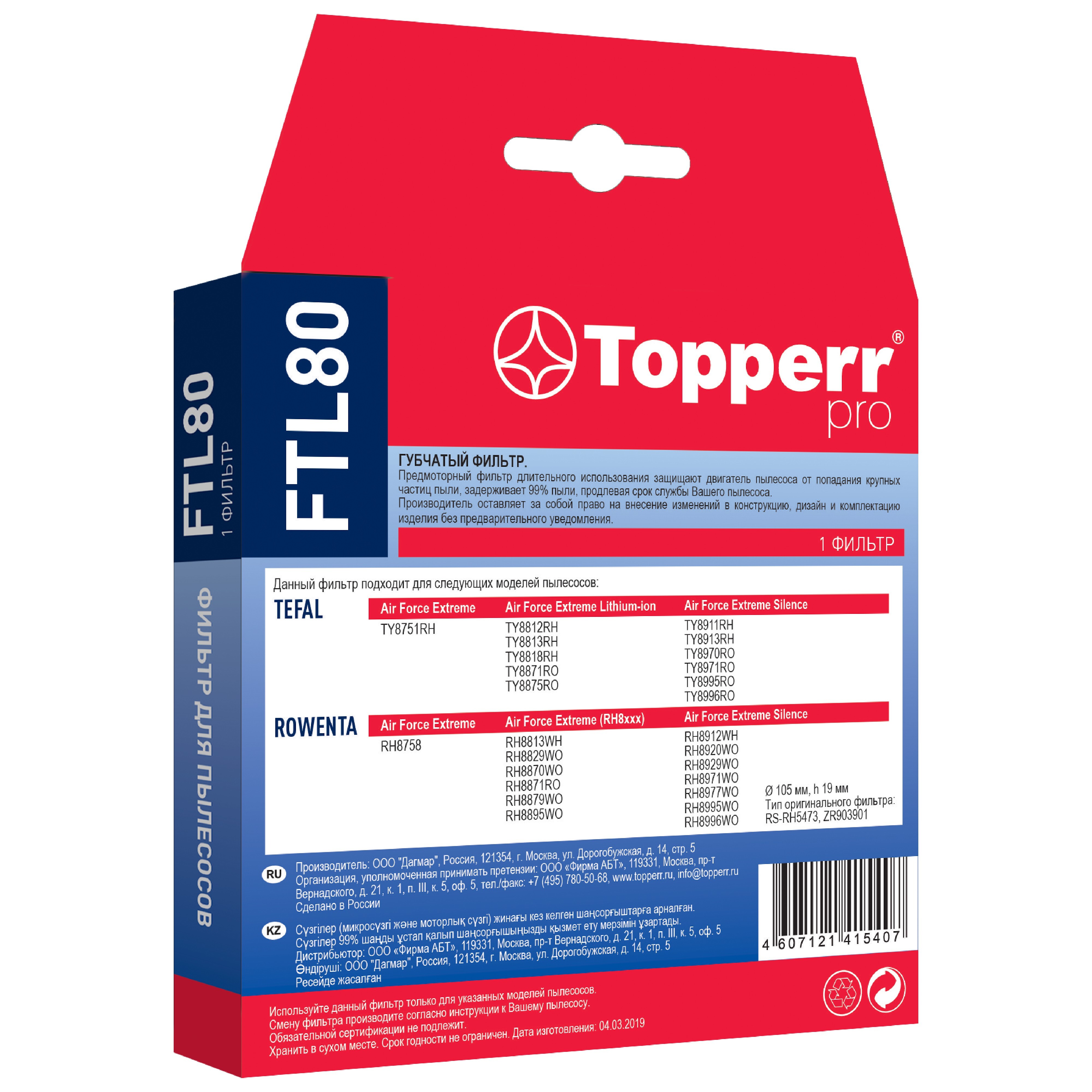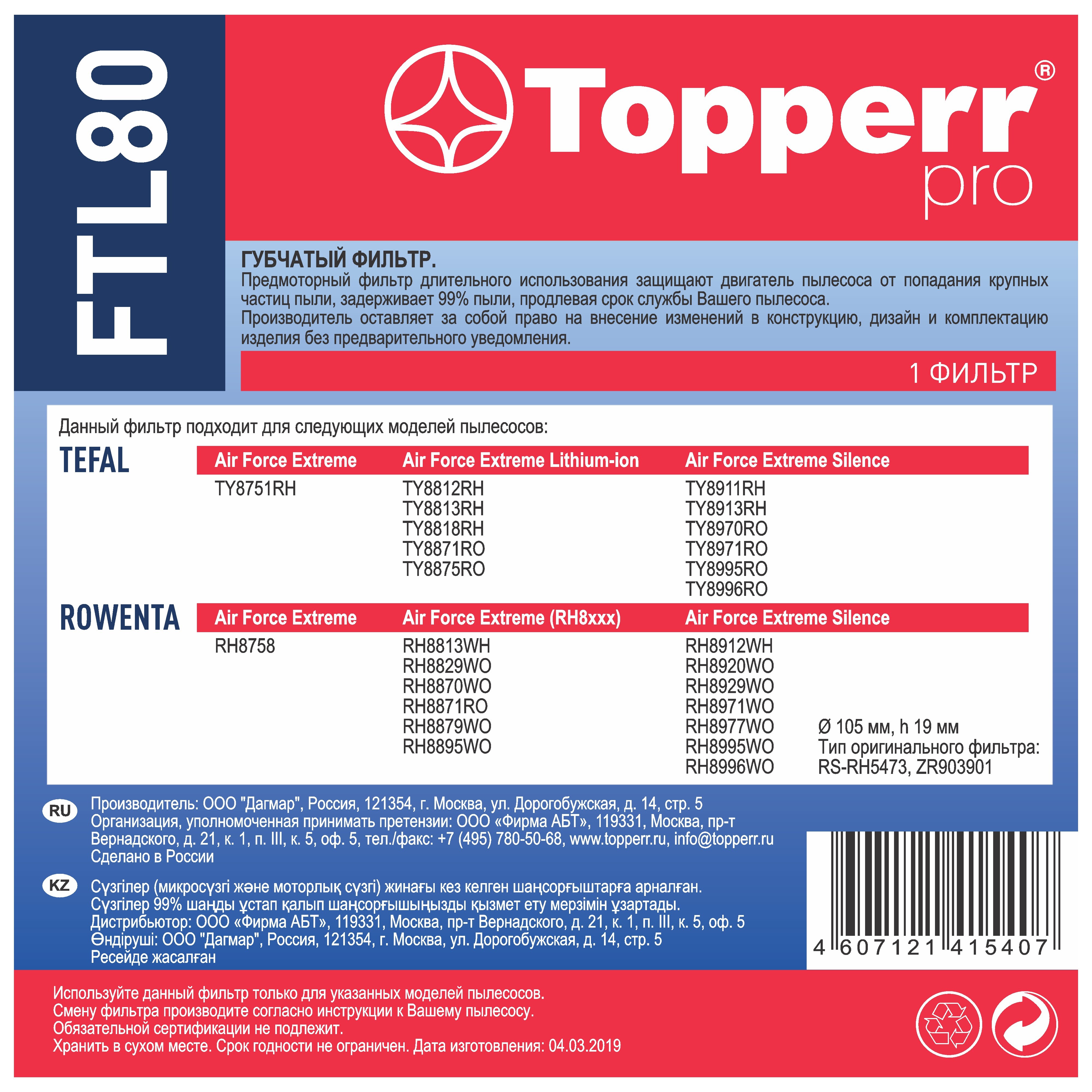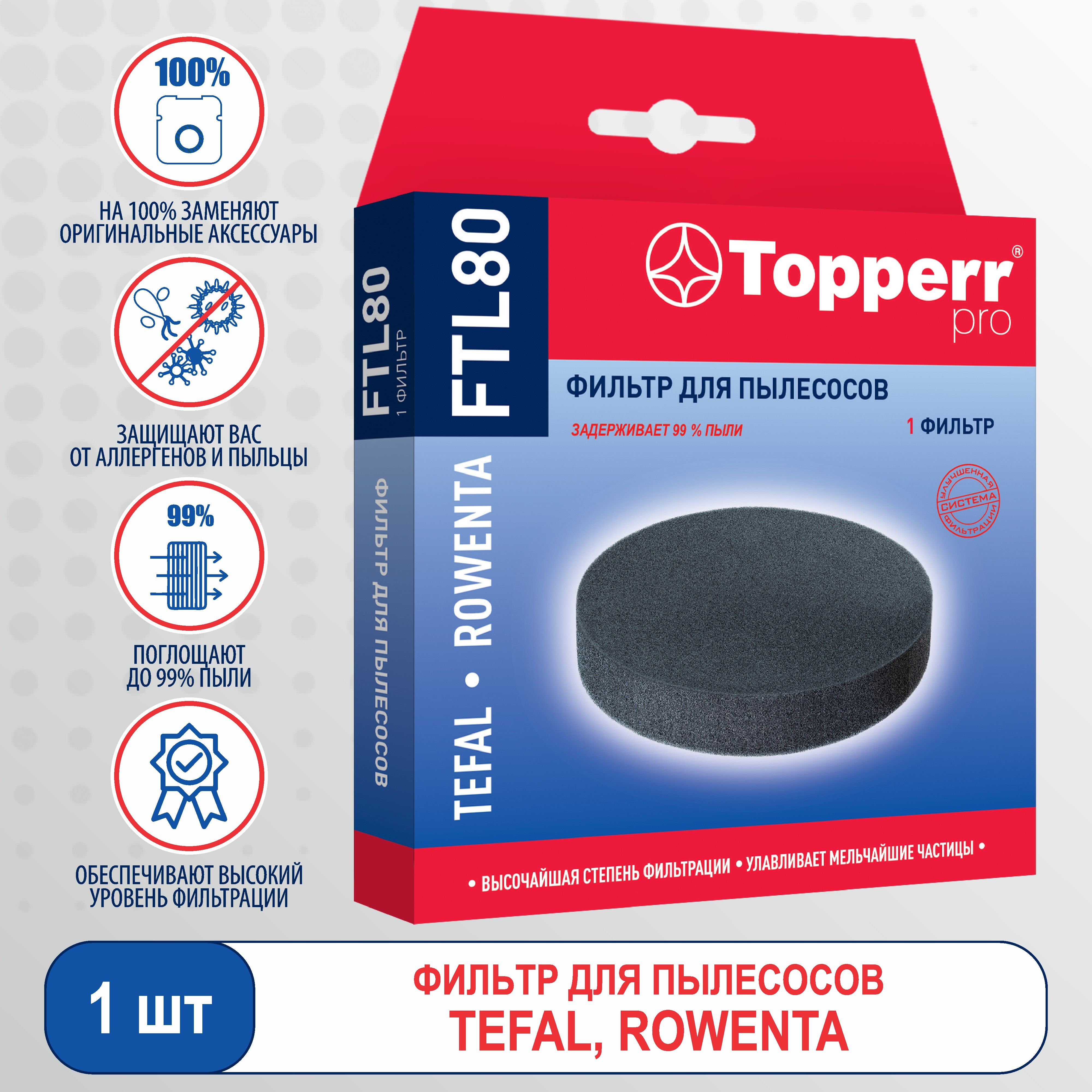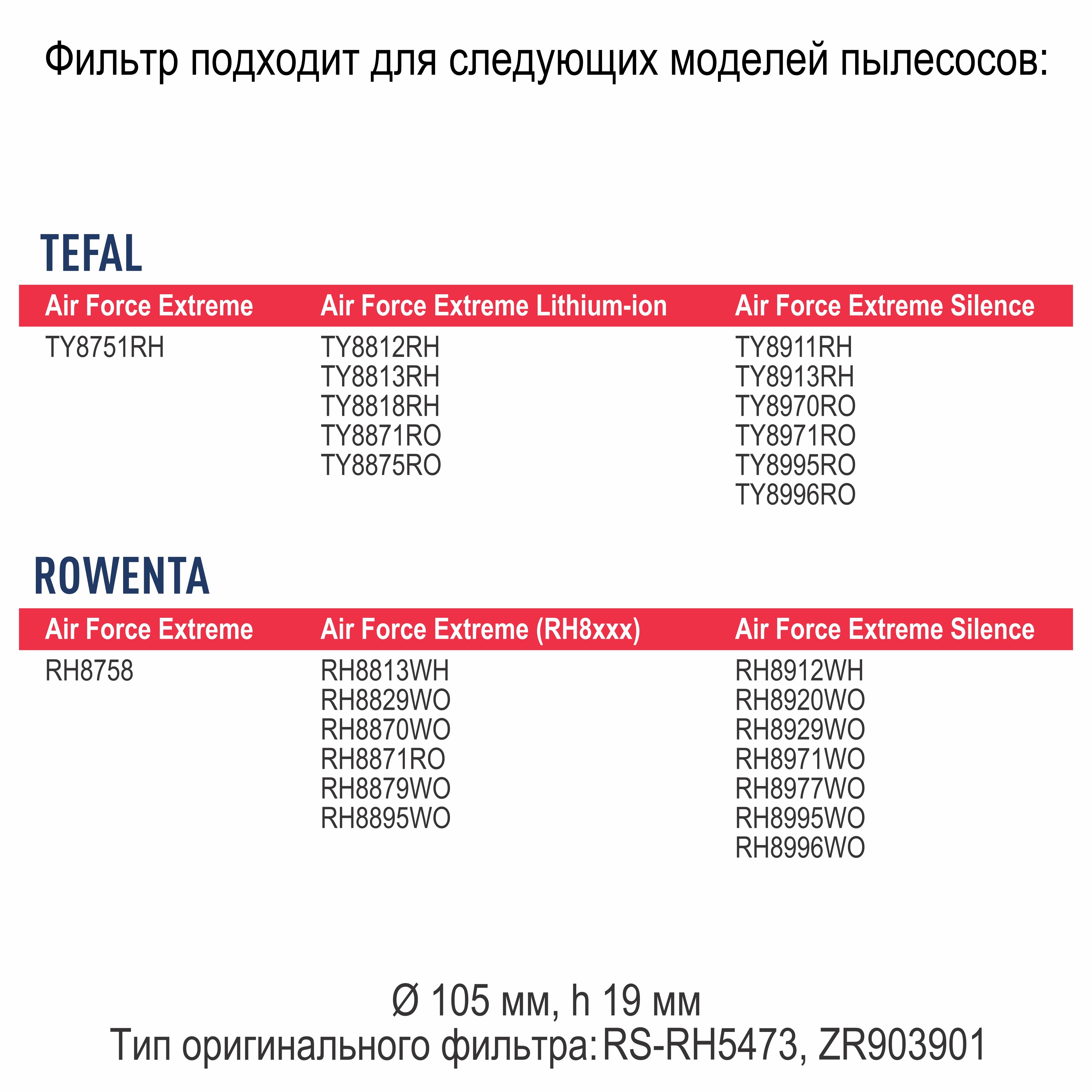 Описание: Фильтр губка-шайба для пылесосов TEFAL, ROWENTA. Диаметр - 105 мм, высота - 19 мм. Tefal: Air Force Extreme Lithium-ion: TY8812RH, TY8813RH, TY8818RH, TY8871RO, TY8875RO. Air Force Extreme: TY8751RH. Air Force Extreme Silence: TY8911RH, TY8913RH, TY8970RO, TY8971RO, TY8995RO, TY8996RO. Rowenta: Air Force Extreme (RH8xxx): RH8813WH, RH8829WO, RH8870WO, RH8871RO, RH8879WO, RH8895WO. Air Force Extreme: RH8758. Air Force Extreme Silence: RH8912WH, RH8920WO, RH8929WO, RH8971WO, RH8977WO, RH8995WO, RH8996WO. (оригинальный тип RS-RH5473, ZR903901). Фильтр для пылесоса обладает высшей степенью фильтрации, обеспечивает удаление пыли благодаря специальным свойствам фильтрующего материала. Этот незаменимый аксессуар для дома помогает избавиться от клещей, бактерий, паразитов, микроорганизмов и пыльцы, препятствуя возникновению и развитию заболеваний (кожа, аллергия, простудные заболевания). Уборка дома принесёт больше удовольствия и эффекта, если в Вашем пылесосе установлен новый фильтр. Topperr - недорогие товары для квартиры, дома, дачи, офиса европейского качества! Topperr 1175 Topperr FTL 80 Tefal - это известный бренд, который производит качественные пылесосы и аксессуары для них. Фильтр для пылесоса Тефаль - один из самых важных аксессуаров. В FairDay Вы можете купить губчатый фильтр для пылесоса Tefal, круглый фильтр на Тефаль - это качественные фильтры, которые помогают избавиться от пыли и аллергенов, легко устанавливается и помогает избавиться от мусора быстро и эффективно. Также для пылесосов Tefal существуют сменные фильтры. Вы можете выбрать фильтр для пылесоса Tefal Compact Power XXL, Tefal Cyclonic, TW3786RA, TW3798EA, TW7689EA и др. Каждый из них имеет свои особенности и может быть использован в зависимости от ваших потребностей. Фильтры для пылесосов Tefal - это необходимые аксессуары, которые помогают сохранить чистоту Вашего дома.