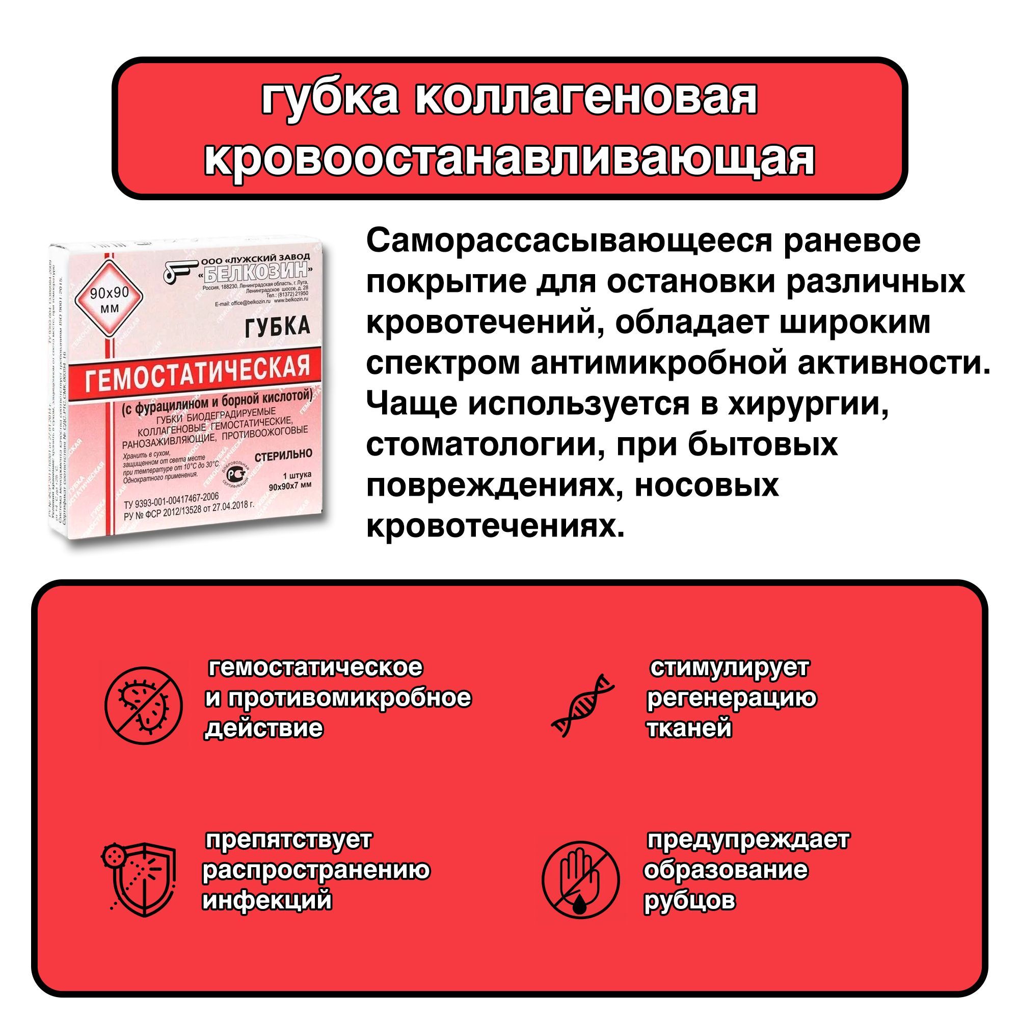 Описание: Губка гемостатическая оказывает кровоостанавливающее и антисептическое действие, стимулирует регенерацию тканей. Толщина губки, позволяет легко моделировать укрываемые контуры при наложении на поврежденные участки ткани. Хорошо адгезирует (прилипает) к раневой поверхности. Оставленная в ране или полости, она полностью рассасывается.