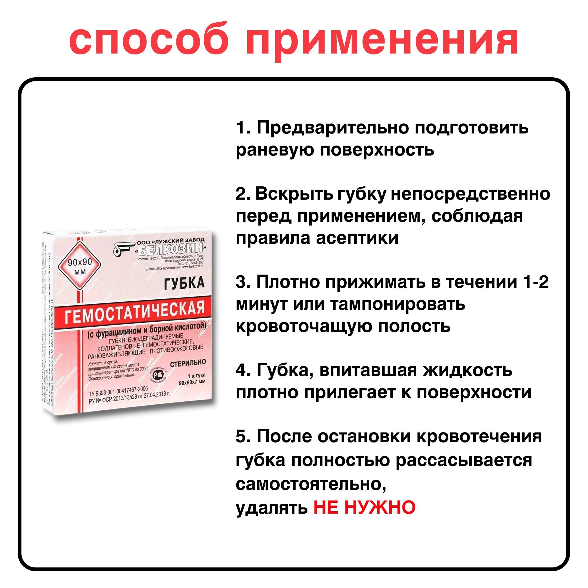 Губку гемостатическую соблюдая правила асептики извлекают из упаковки, накладывают на кровоточащее место и прижимают к нему в течение 1-2 минуты , или плотно тампонируют кровоточащую поверхность с последующим бинтованием. После остановки кровотечения губку не удаляют, так как она в последствии полностью рассасывается. После пропитывания кровью губка плотно прилегает к кровоточащей поверхности, при необходимости, фиксируется липким бинтом. Если кровотечение не останавливается, накладывается второй слой губки. Кровоостанавливающее действие губки усиливается, если ее дополнительно смочить раствором тромбина. После остановки кровотечения губку не удаляют, так как впоследствии она полностью рассасывается.