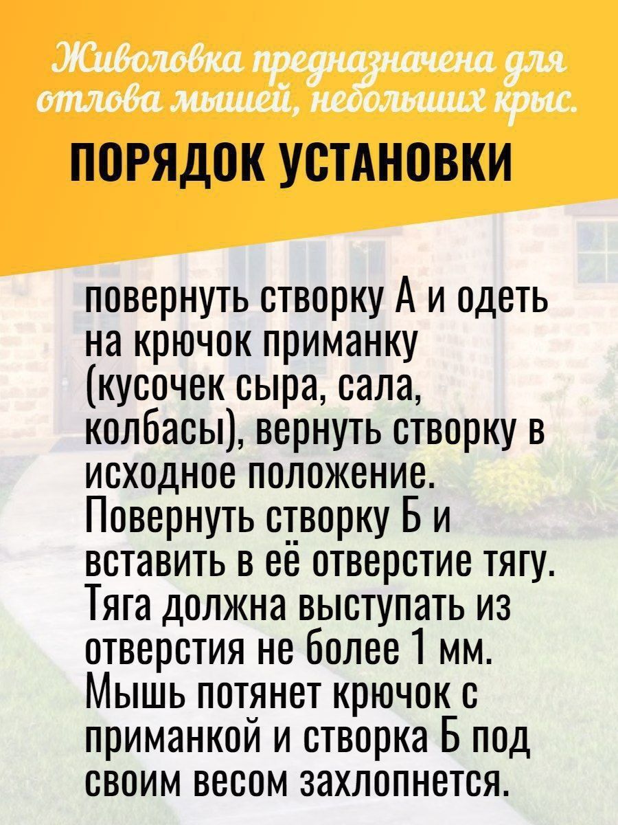 Описание: Размер металлической мышеловки Клетка 130x70x65 мм. Для правильной работы мышеловки язычок нужно установить на Край крючка сверху. Это гуманная мышеловка домик. Она хороша тем, что зверек остается живым, а не погибает от удара по голове и не мучится часами, пытаясь освободиться из клейкой ловушки. Также она безопасна для детей и домашних животных, ведь в ней отсутствуют элементы, которые могут травмировать любопытного ребенка или питомца. Кстати, если у вас сбежал хомяк, эта живоловка поможет вернуть его в клетку - просто используйте вместо стандартной приманки подсолнечные семечки или кусочки ароматных фруктов. Как выглядит мышеловка домик Гроза? Эта ловушка для мышей сделана в виде прямоугольной коробки. Размер оптимальный для мелких грызунов и в то же время позволяет спрятать мышеловку в укромном месте. Конструкция полностью выполнена из стали - нержавеющей или оцинкованной, так что даже если использовать ее во влажном помещении, она будет служить долгие годы.