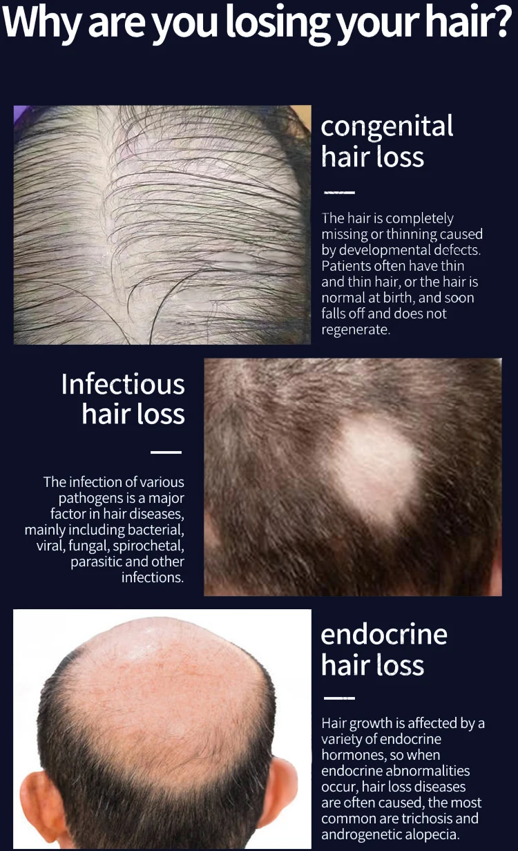 Hair loss caused by hair coloring,Seasonal hair loss,Postpartum hair loss,Upward movement of hairline,Oily fatty hair loss,Stress hair loss,M hair loss,Diffuse hair loss,Genetic hair loss,Late-night hair loss,patchy baldnes
