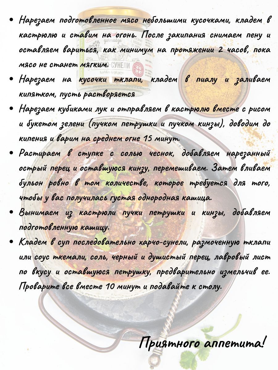 Описание: Авторская приправа харчо-сунели - это оригинальный букет пряностей, созданный для приготовления знаменитого супа харчо. Традиционный грузинский суп из говядины с рисом полюбился многим гурманам, но не у всех получается приготовить его в домашних условиях. Наша уникальная приправа создана, чтобы упростить задачу повару. Все что нужно, это приобрести приправу харчо-сунели и воспользоваться рецептом, представленным в фото данной карточки, и гастрономический восторг будет гарантирован. Помимо этого приправа не боится импровизаций и хорошо подходит для рыбных блюд и блюд из птицы.