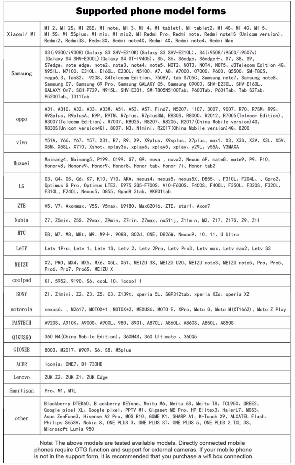 1. Перед заказом, пожалуйста, убедитесь, что ваш телефон поддерживает функцию OTG и UVC, если не эти функции, они не могут работать. Вы можете проверить его, используя тест OTG мягкий, или выполните поиск функции из интернета по модели вашего телефона. 100% поддержка ПК системы.
