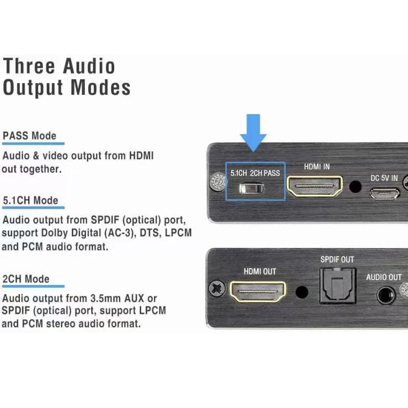 * HDMI-совместимый для достижения синхронизации разделения аудиосигналов. * Есть PASS/2,0CH/5,1CH три вида вариантов аудиорежима.