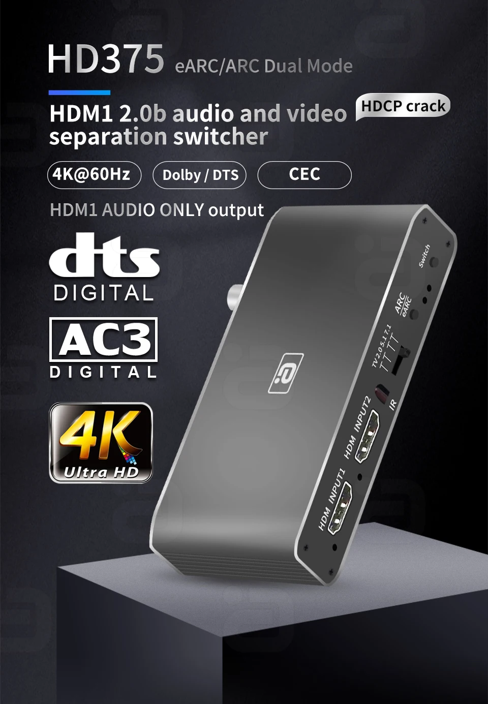 HD375-это высокопроизводительный экстрактор разделения звука HDMI2.0b с двумя входами и одним выходом.