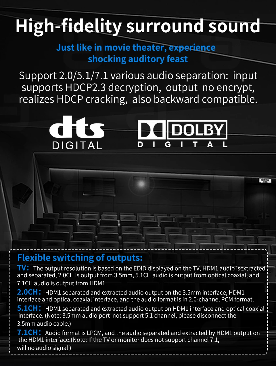 (1) Функция разделения звука: Отделите входной HDMI-совместимый звук и выход от оптического волокна, наушников, HDMI-совместимого AUDIO только;