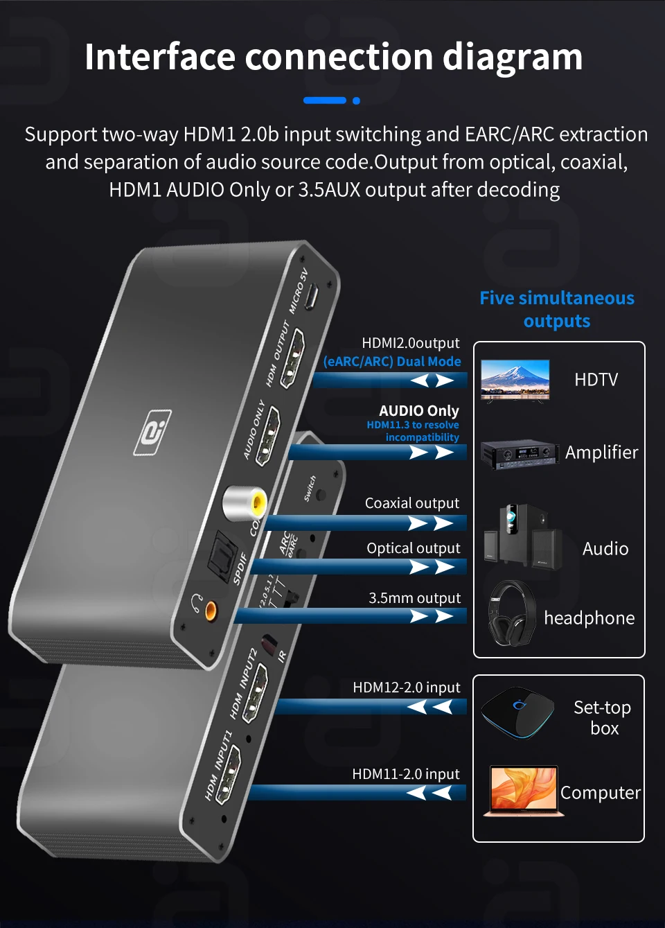 (1) Он имеет два входа HDMI2.0b и один HDMI-совместимый выход с функцией извлечения звука.